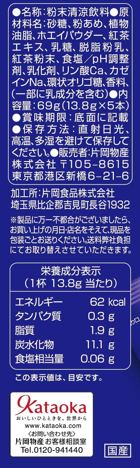原材料:砂糖、粉あめ、植物油脂、ホエイパウダー、紅茶エキス、乳糖、脱脂粉乳、紅茶粉末、食塩/pH調整剤、乳化剤、リン酸Ca、カゼインNa、環状オリゴ糖、香料、(一部に乳成分を含む)