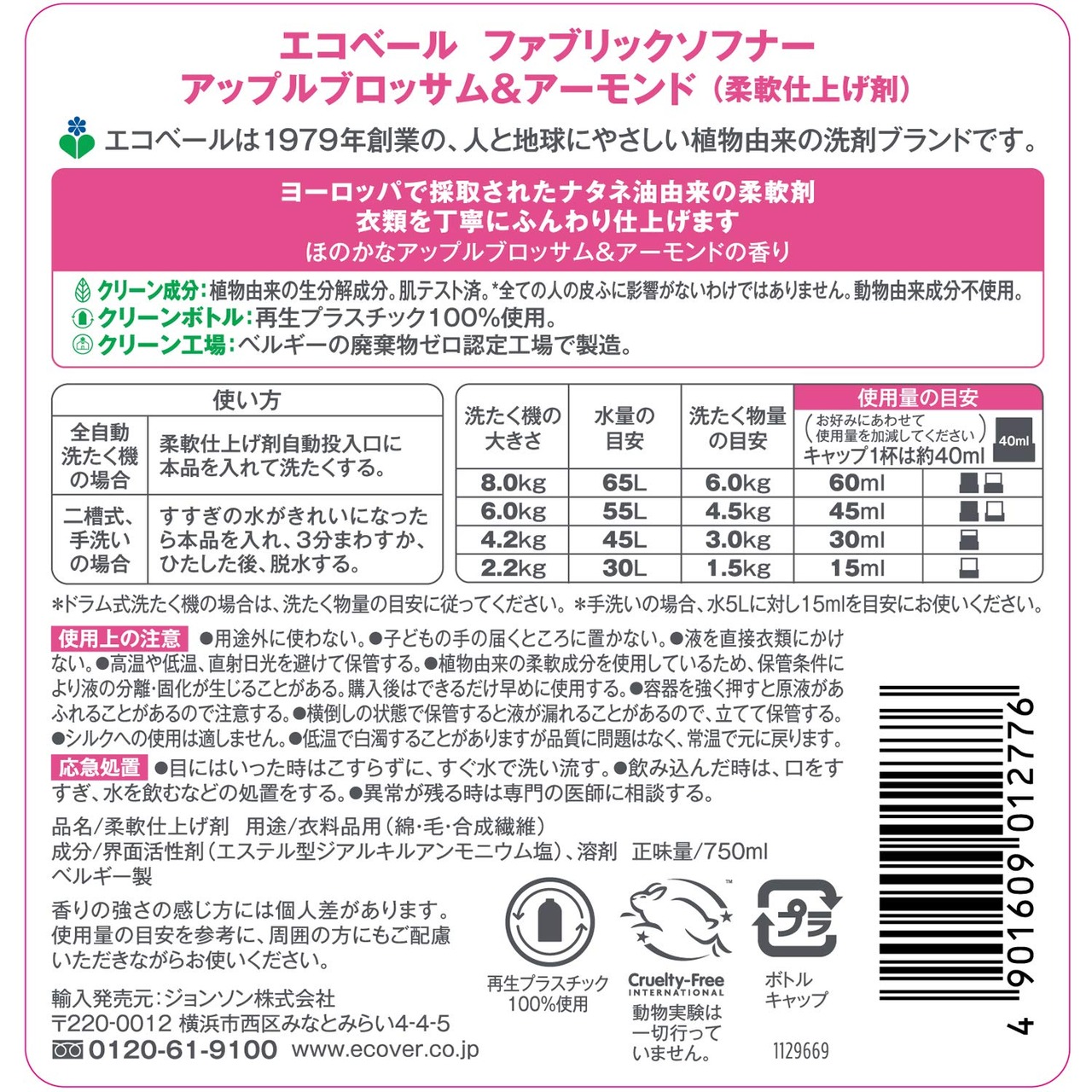 ECOVER(エコベール) エコベール 柔軟剤 本体 アップルブロッサム&アーモンドの香り 750ml ecover ファブリックソフナー 洗濯 赤ちゃん laundly 日用品 ベビー