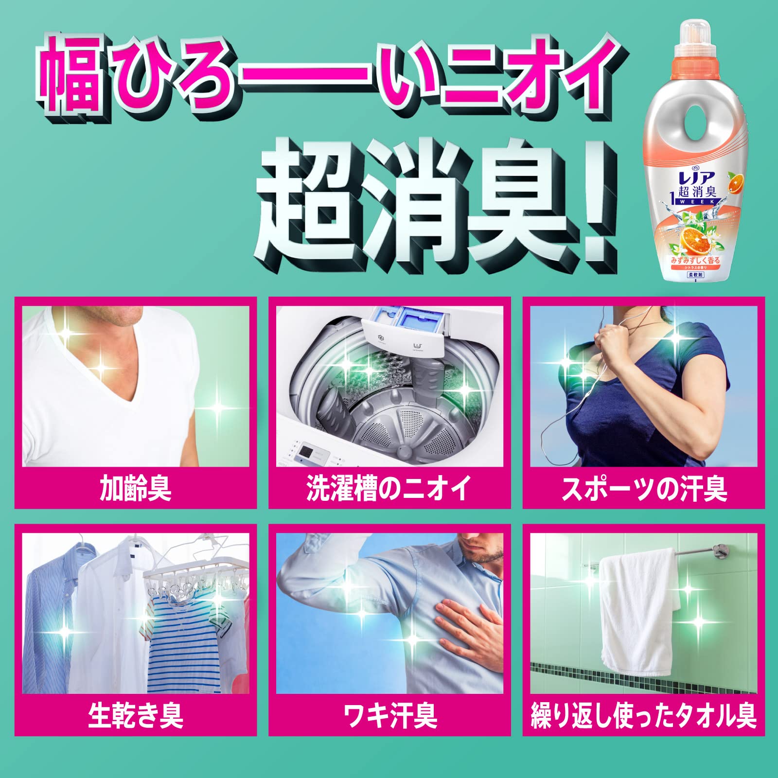 1週間ずーっと消臭* 1幅広いニオイ超消臭: スポーツの汗臭、洗濯槽のニオイ、枕カバーの加齢臭、体臭、部屋干しの生乾き臭衣類の花粉ブロック* 2静電気ブロック*1 保管状態で*2 静電気を防ぐ効果による 柔軟剤