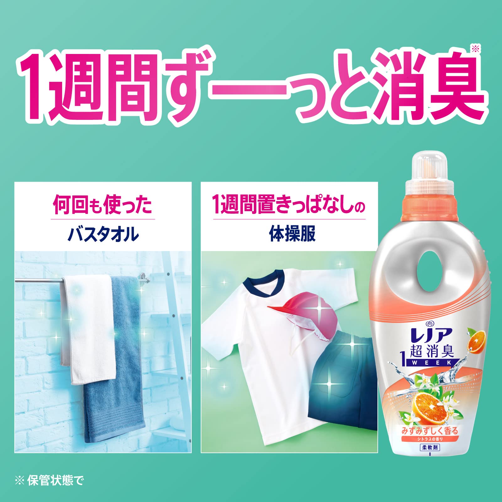 レノア超消臭1WEEKは、80%以上の消費者が実感した、1週間ずーっと続く消臭力(*1)。 かけっぱなしの洗面所のタオルや、ニオイが気になるけれど毎日は洗えない、シーツや枕カバーまで、1週間ずーっと爽やか(*1)。 *1 保管状態で