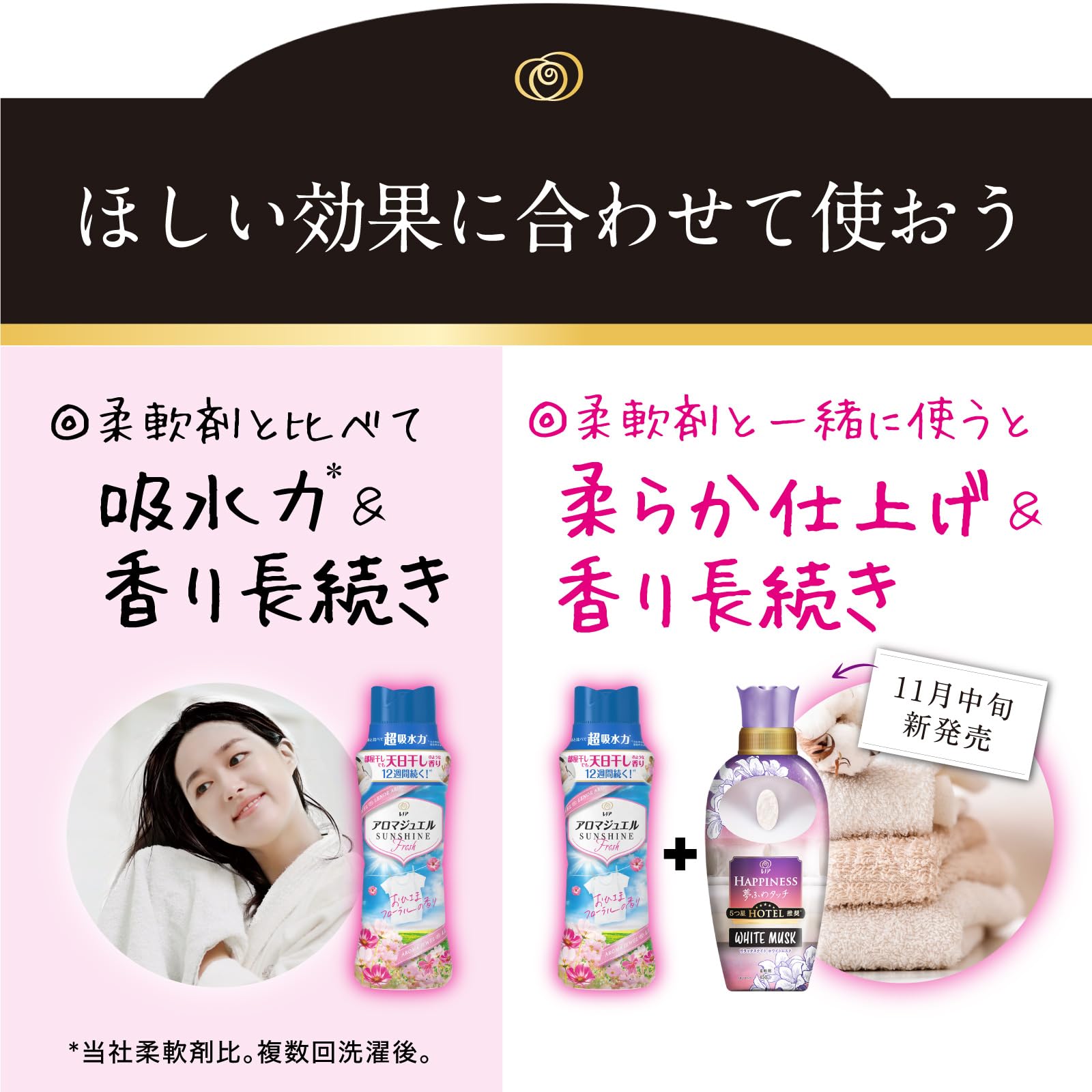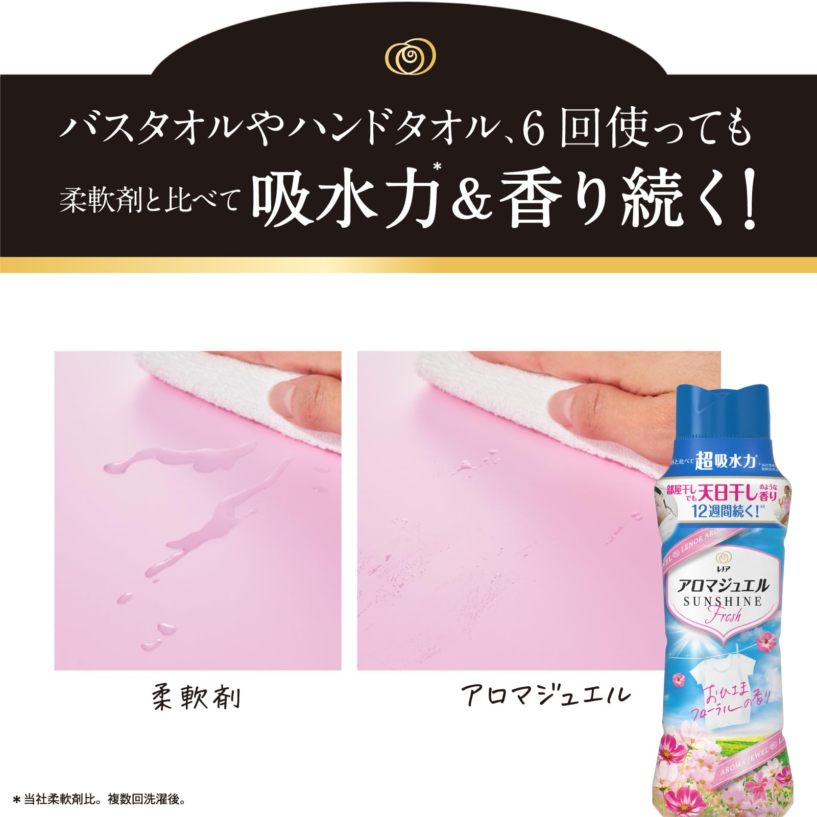部屋干しでも天日干しのような香り12週間続く!*1髪ふくタオルの水分さらっと吸収*スポーツの汗さらっと吸収*柔軟剤と比べて吸水力* &香り長続きお洗濯のはじめに入れるだけ!縦型ドラム式どちらでもOK通常※の1.7倍 ※アロマジュエル通常サイズ(470mL)より*当社柔軟剤比。複数回洗濯後。*1 保管状態で