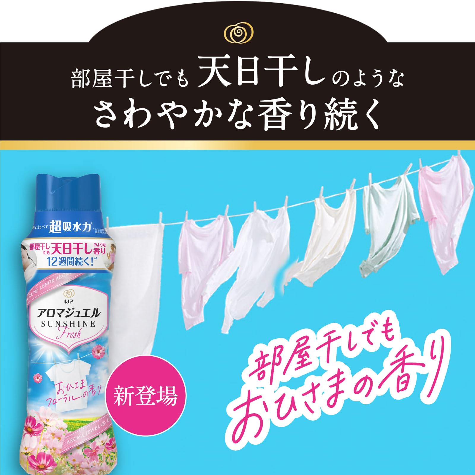 アロマジュエルおひさまフローラルの香りは、たとえ部屋干しでも、天日干しした時のようなさわやかなおひさまの香りが12週間続く*!(*保管状態にて。)