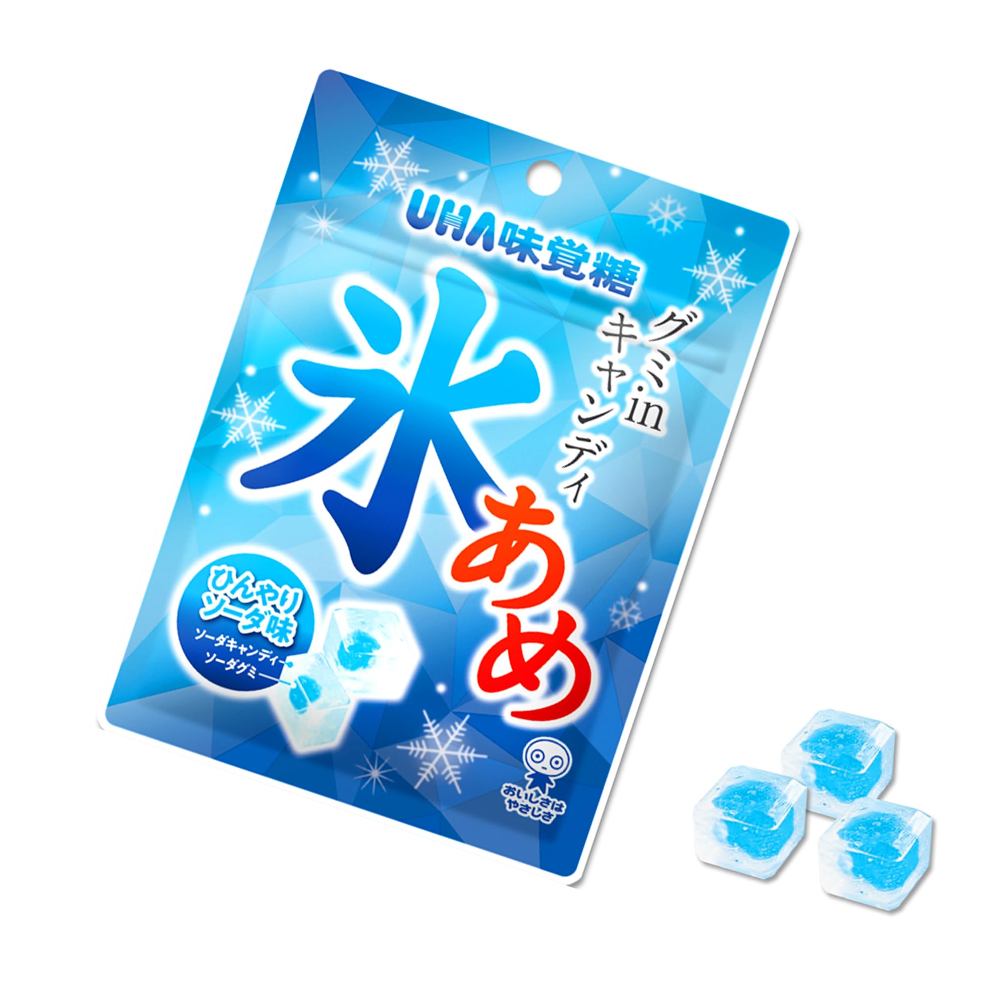 氷のように透明な立方体のキャンディ。ひんやりキャンディの中にひんやりグミを入れました。清涼感あふれるソーダ味。