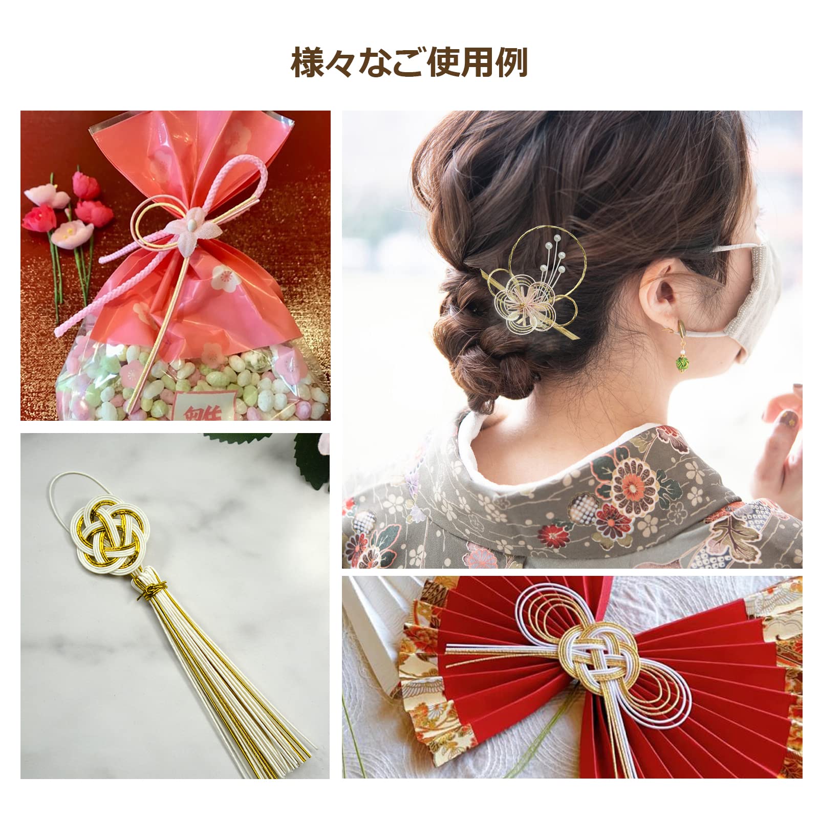 【水引髪飾りに】 喜びや願い、祈りを込め、様々なかたちに結ばれてきた水引です。伝統的な和のイメージが強い水引を、現代風にアレンジした商品です。今人気の水引きを様々なアレンジにお使いいただけます。前撮り、成人式、卒業式、ウェディングの際などにお使いいただけます。手芸やラッピング、水引き髪飾り手作り、水引細工に「和」のアクセント!自分でDIY水引き髪飾りお客様自身の服を飾るために。