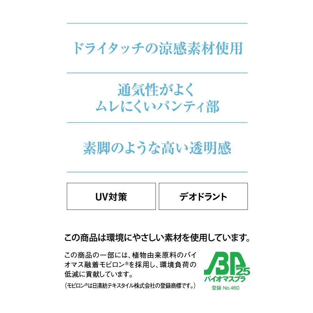 肌ざわりのいい涼感素材を使用した、汗ばむ季節にうれしい夏用パンティ部は通気性が良くムレにくいエアスルーメッシュ立体設計。