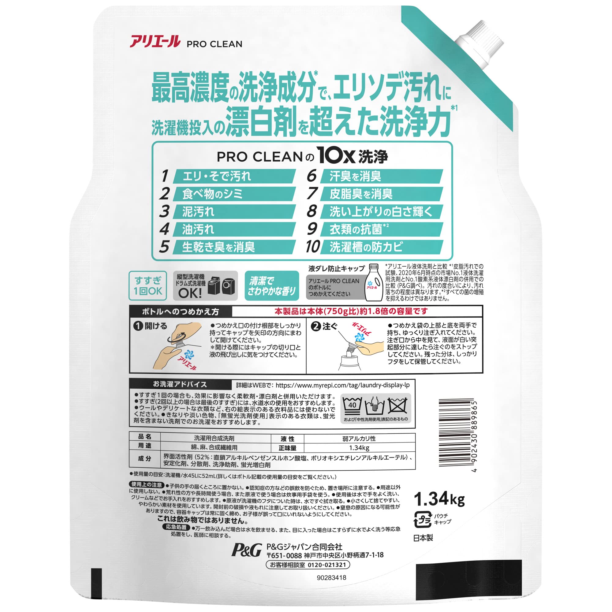 【まとめ買い】 アリエール プロクリーン 洗濯洗剤 液体 エリソデ汚れに洗濯機投入の漂白剤を超えた洗浄力 詰め替え 超特大 1340g (約1.8倍) × 2個