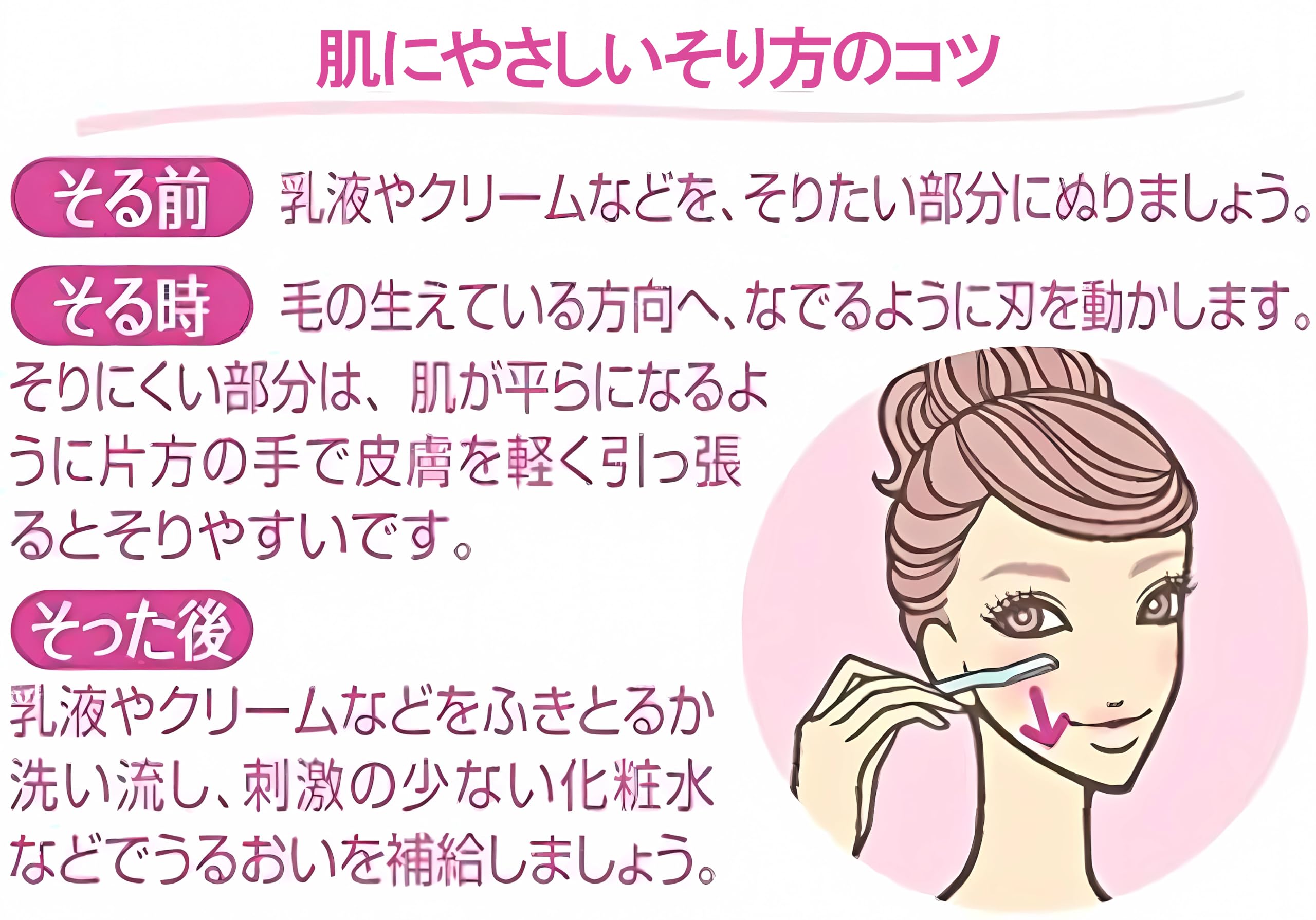 ●肌にやさしいムダ毛ケアのコツ(1)そる前:乳液やクリームなどを、そりたい部分にぬりましょう。(2)そる時:毛の生えている方向へ、なでるように刃を動かします。そりにくい部分は、肌が平らになるように片方の手で皮膚を軽く引っ張るとそりやすいです。(3)そった後:乳液やクリームなどをふきとるか洗い流し、刺激の少ない化粧水などでうるおいを補給しましょう。