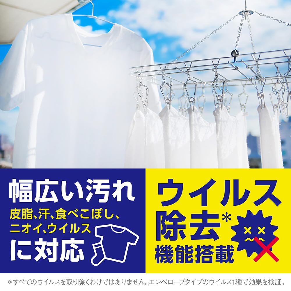 【さらさらリキッドがまとめ洗いでも繊維の奥まで浸透洗浄。幅広い汚れをさらっと落とし、黄ばみを防いで衣類を白く洗いあげる液体洗剤。】