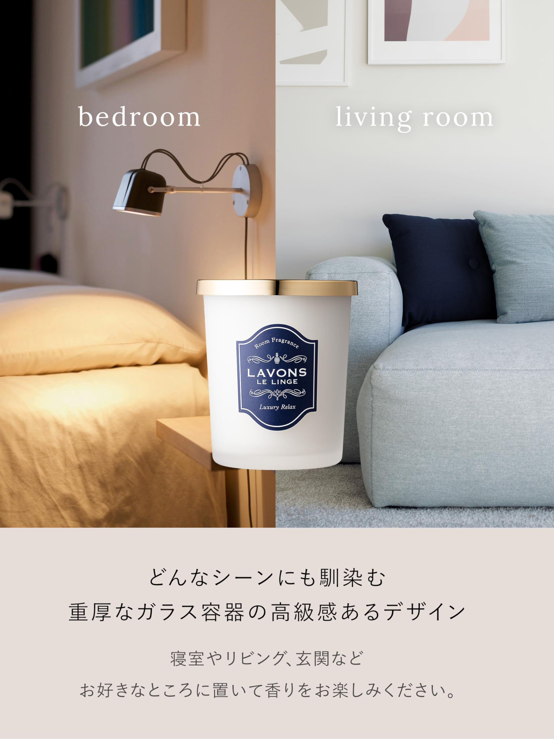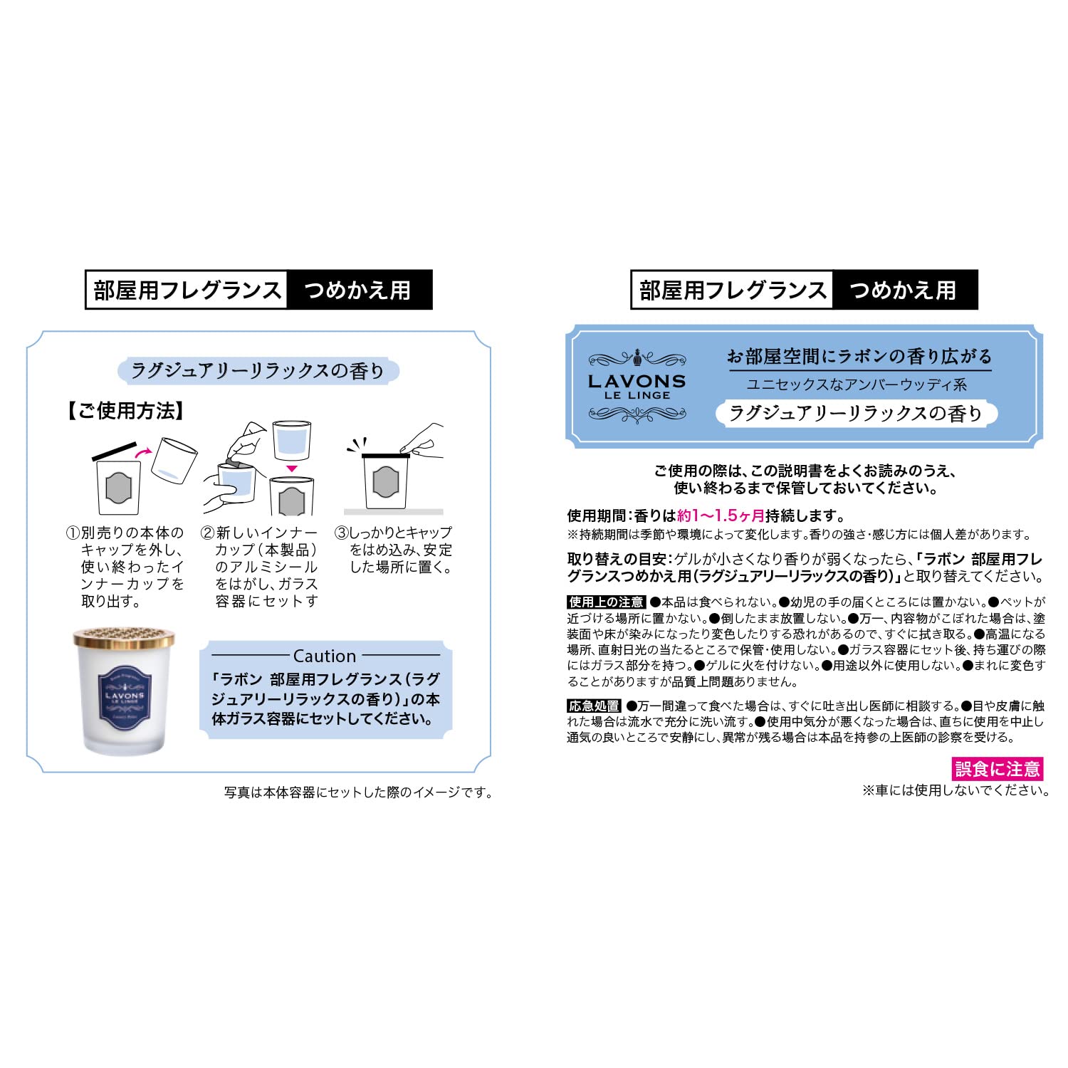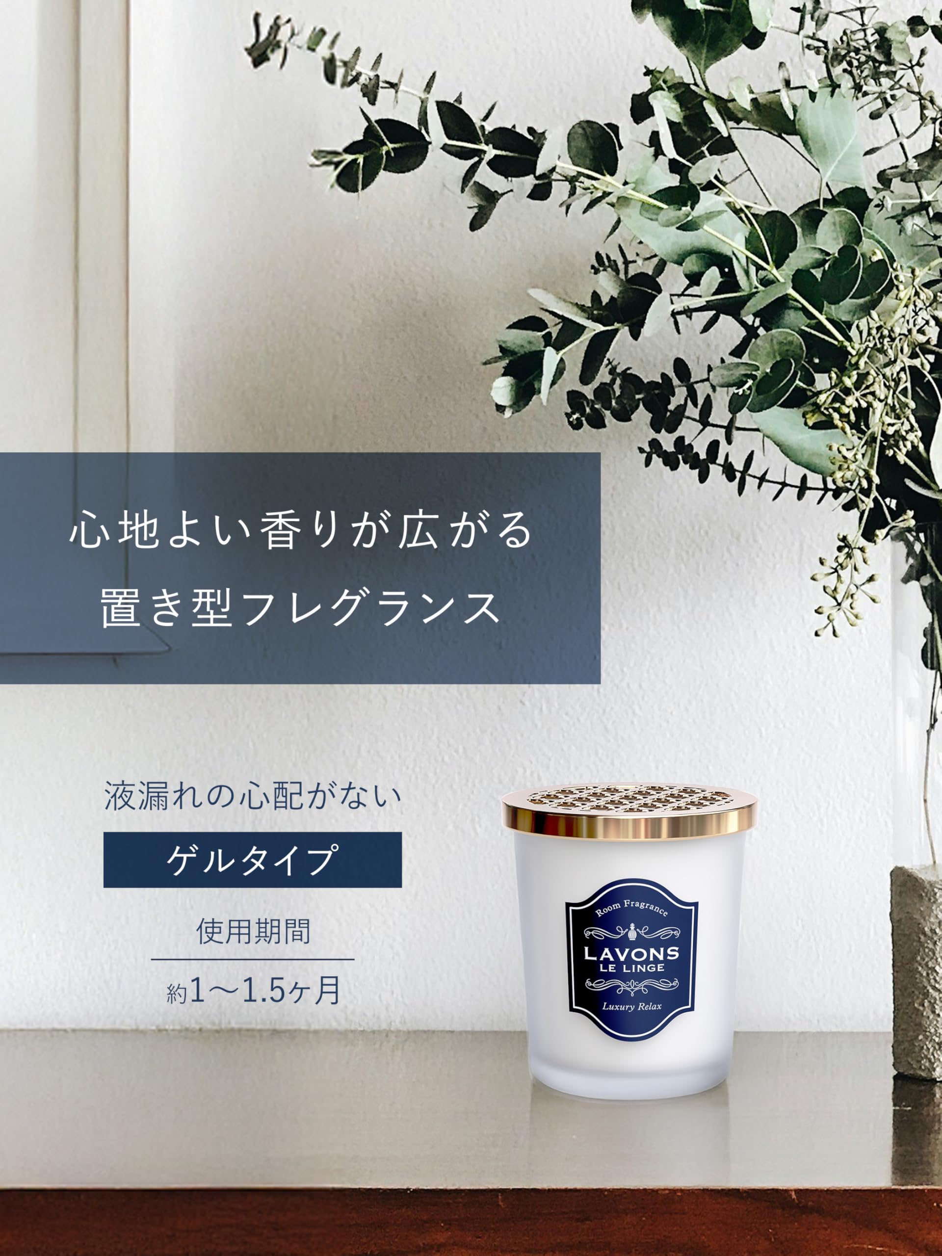 お部屋空間にラボンの香りが広がるゲルタイプのルームフレグランス。カップを入れ替えるだけで簡単にセットできるお得な詰め替え用です。ユニセックスなアンバーウッディ系〈ラグジュアリーリラックス〉の香り。