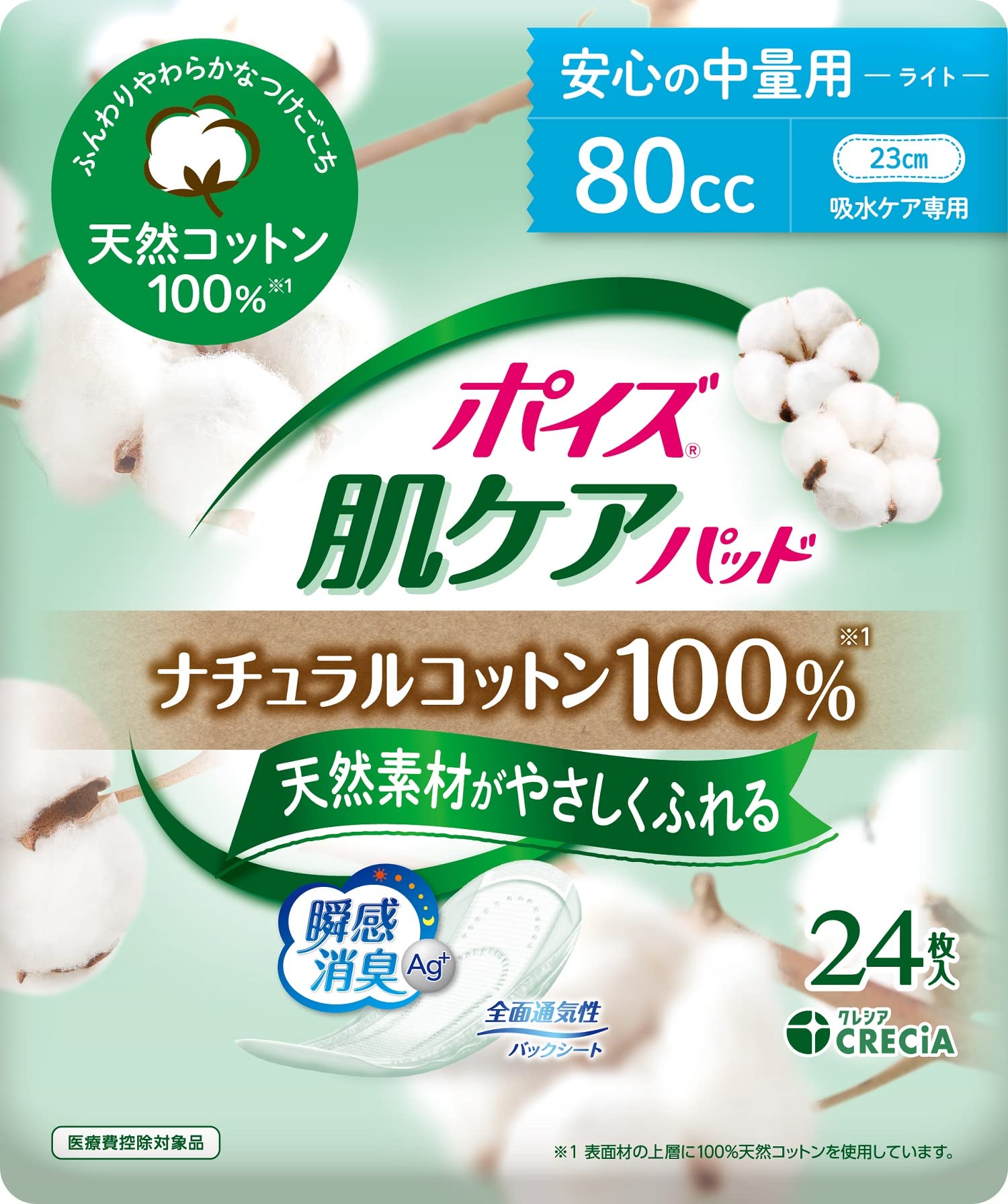 【数量限】吸水ナプキン ポイズ 80cc 23cm 24枚 ナチュラルコットン100% 安心の中量用 (女性の軽い尿もれ用) 肌ケアパッド
