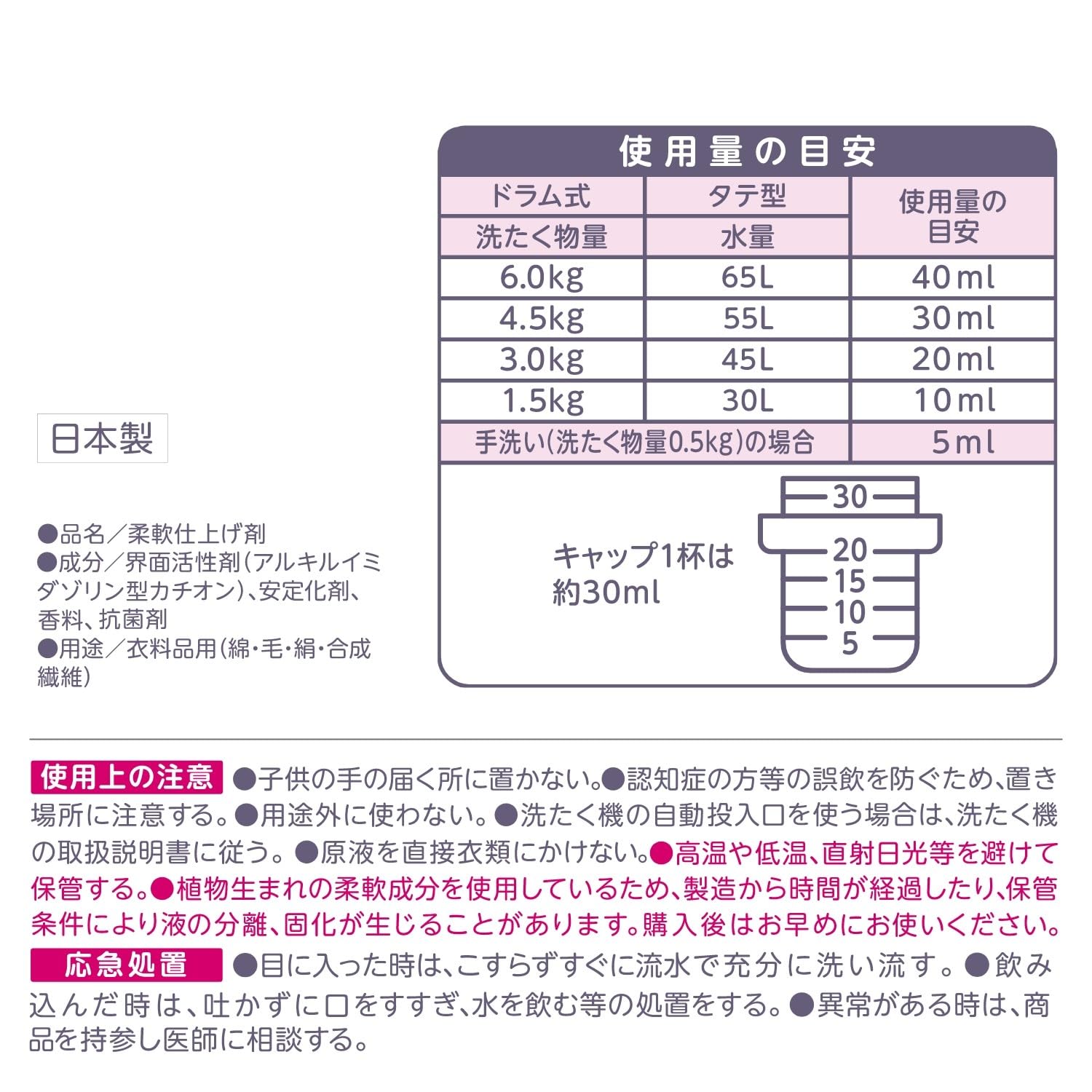 洗濯物量の目安1.5kg/水量の目安30L/使用量の目安10ml、3.0kg/45L/20ml、4.5kg/55L/30ml、6.0kg/65L/40ml