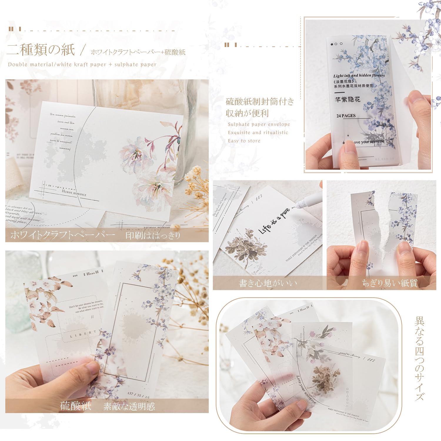 96枚入りのヴィンテージ風のデザインペーパーセットです。パターンも豊富でどれも雰囲気があって素敵です。紙質もホワイトクラフトペーパーと硫酸紙、異なるもの2種が入っております。カットしてデコやコラージュに、便箋のようにお使いいただくのも素敵かと思います。