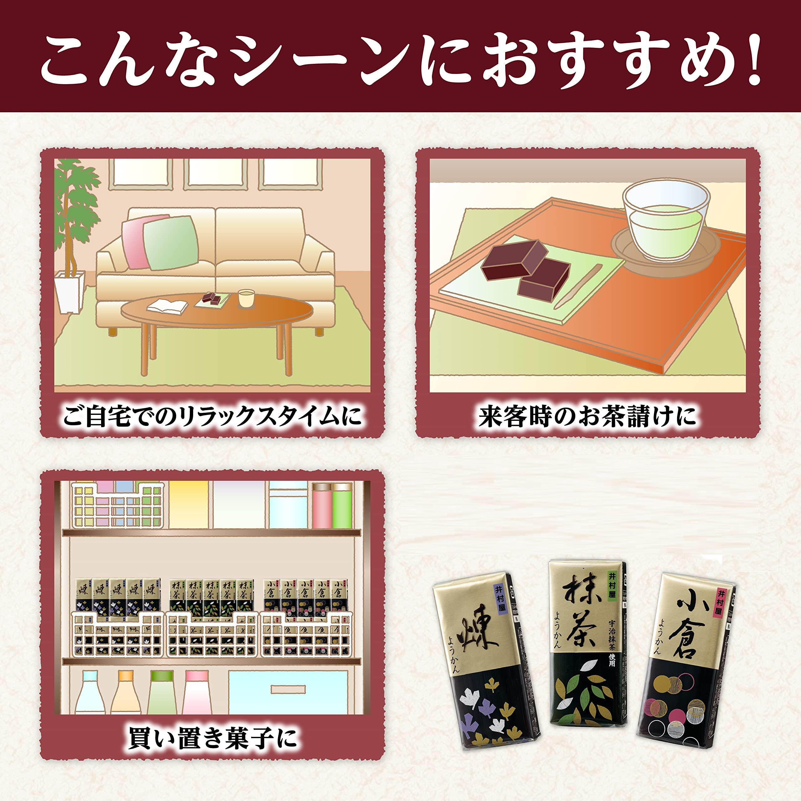 宇治抹茶の風味が豊かな抹茶ようかんです。スーッとあけやすいアイノッチを採用し、開封性を向上させました。小腹がすいたときや、ちょっと甘いものがほしいときに適した食べ切りサイズのミニようかんです。コンパクトに常温保存できるため、リラックスタイムのおやつとして、来客時のお茶請けとしてのストックに便利です。