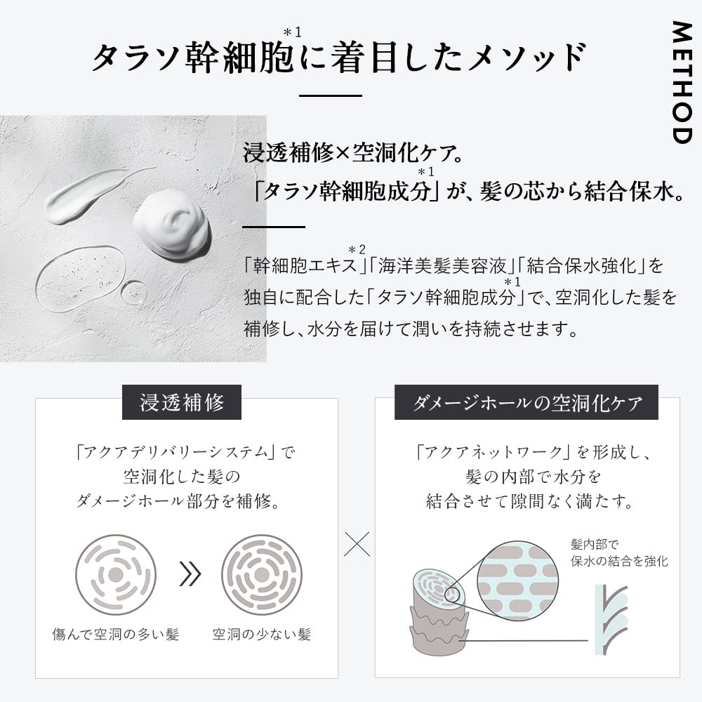 ダメージを受けたパサつきがちな髪に、水分を届けて束縛。乾燥しがちな頭皮も保湿して美髪作りをサポートし、髪がぷるんと潤い毛先までしっとりまとまります。