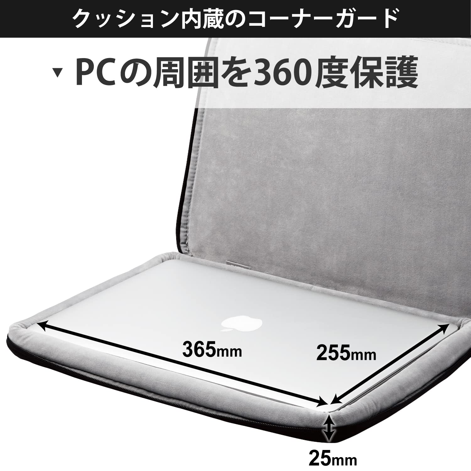 側面を360度保護するコーナーガードクッションと、天面、底面それぞれに内蔵された低反発ウレタンフォーム、機器表面を傷つけない内側の優しい起毛生地によって、収納物を徹底的に保護します。撥水加工を施した落ち着いた風合いの生地を採用したシンプルなデザイン。保護性能とスリムを両立させたインナーケースです。
