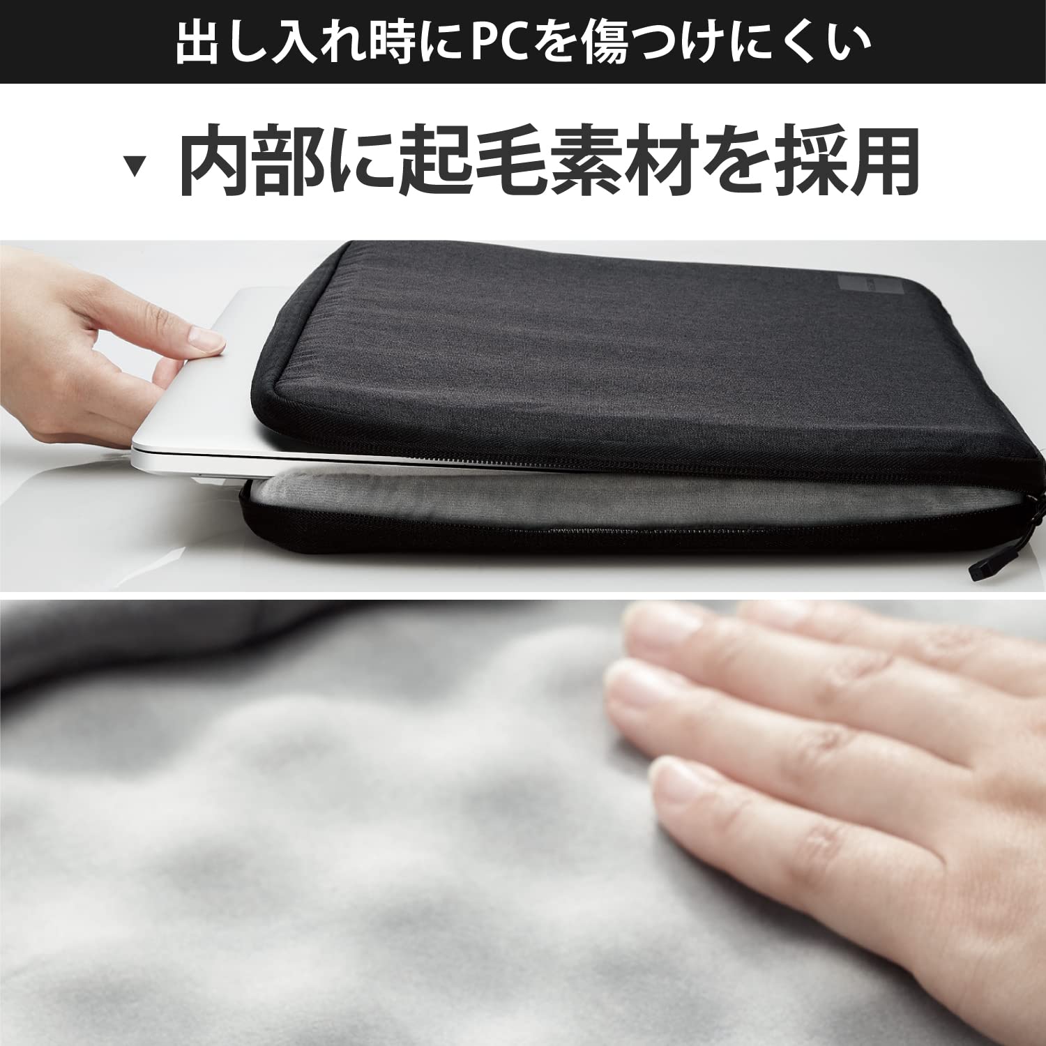 ケース内部には、出し入れ時にパソコン本体を傷つけにくい起毛素材を採用しています。