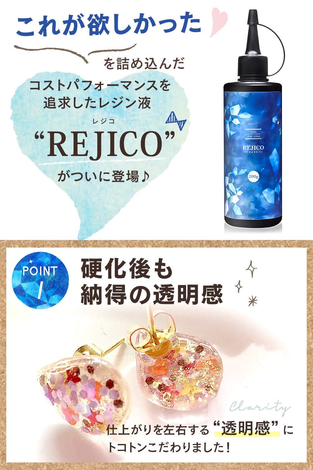?【 お得な 200g 超大容量タイプ! 】ハードタイプのUV-LED対応レジン液(200g) “これが欲しかった” を詰め込んだレジン液 ”REJICO” がついに登場! ?【 硬化後も納得の透明感 & 着色剤もキレイに混ざる!】お客様のご要望にお応えして、仕上がりを左右する透明感にトコトンこだわりました! 高い透明度だから着色剤もキレイに混ざって鮮やかな仕上がりになります ♪