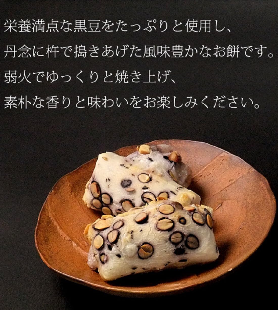 栄養満点な黒豆をたっぷりと使用し、丹念に杵で搗きあげた風味豊かなお餅です。弱火でゆっくりと焼き上げ、素朴な香りと味わいをお楽しみください。