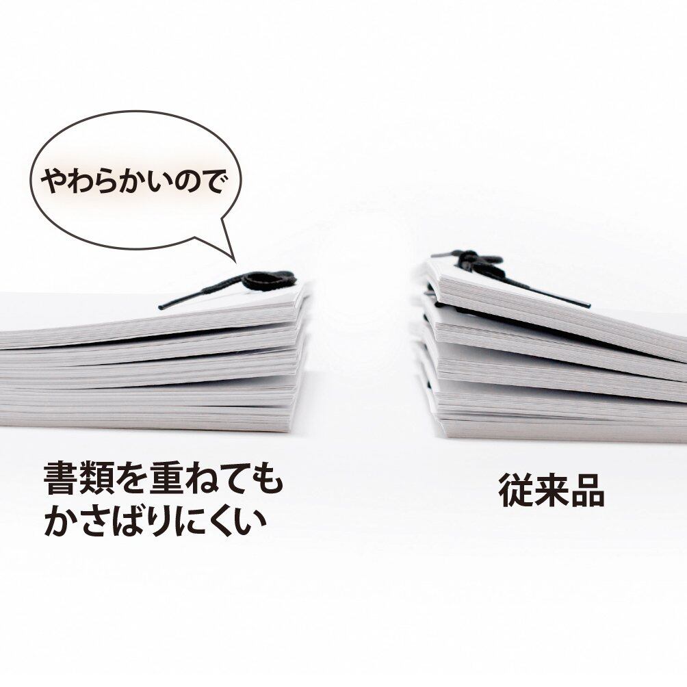 ・ひもの芯を抜くことで書類を重ねてもかさばりにくいつづりひもです。