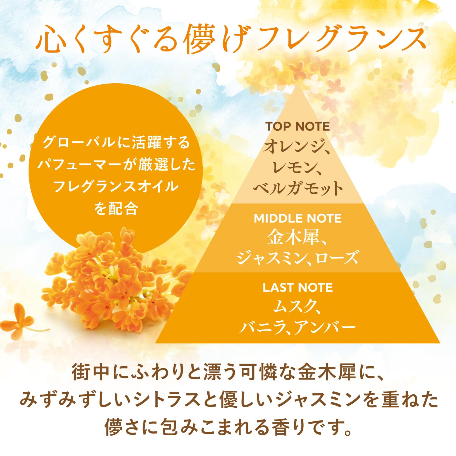 街中にふわりと漂う可憐な金木犀に、みずみずしいシトラスと優しいジャスミンを重ねた儚さに包みこまれる香りです。