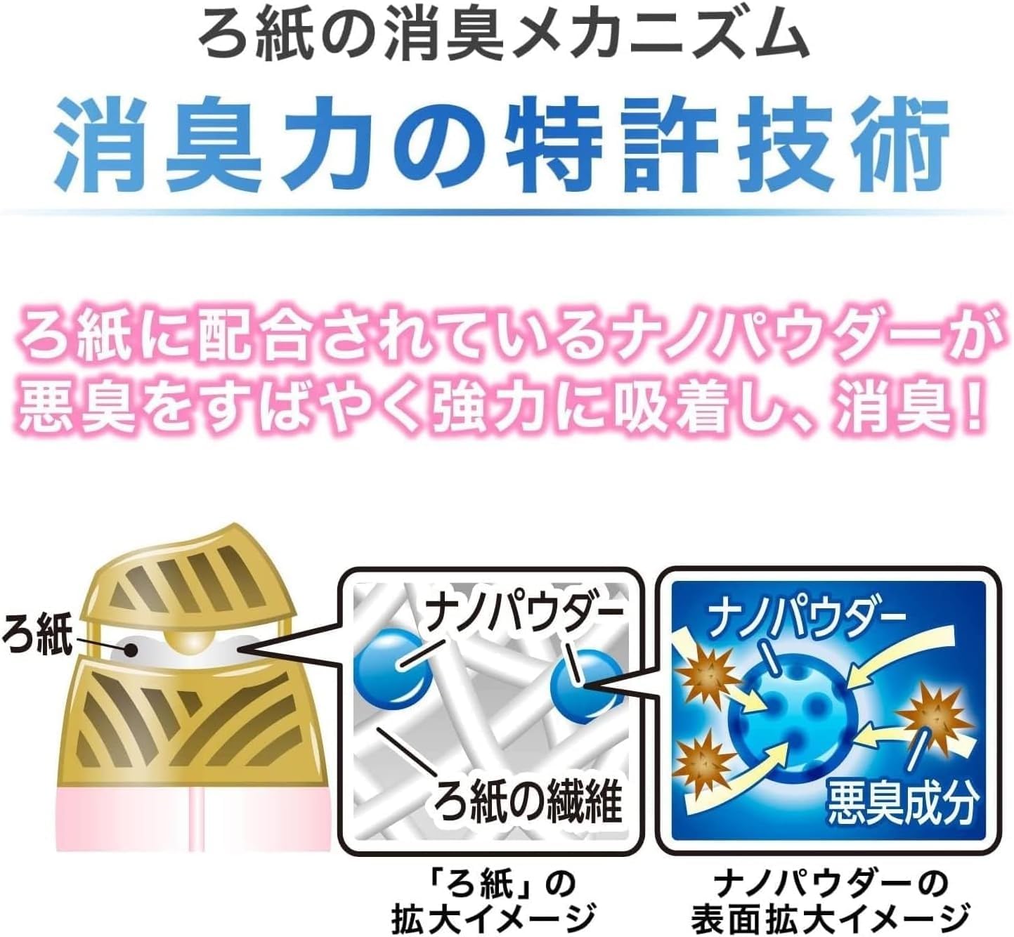 【ナノパウダー※配合】すばやく強力に空間を消臭。※ナノレベルの孔(あな)を持つ、悪臭を吸着する消臭剤。