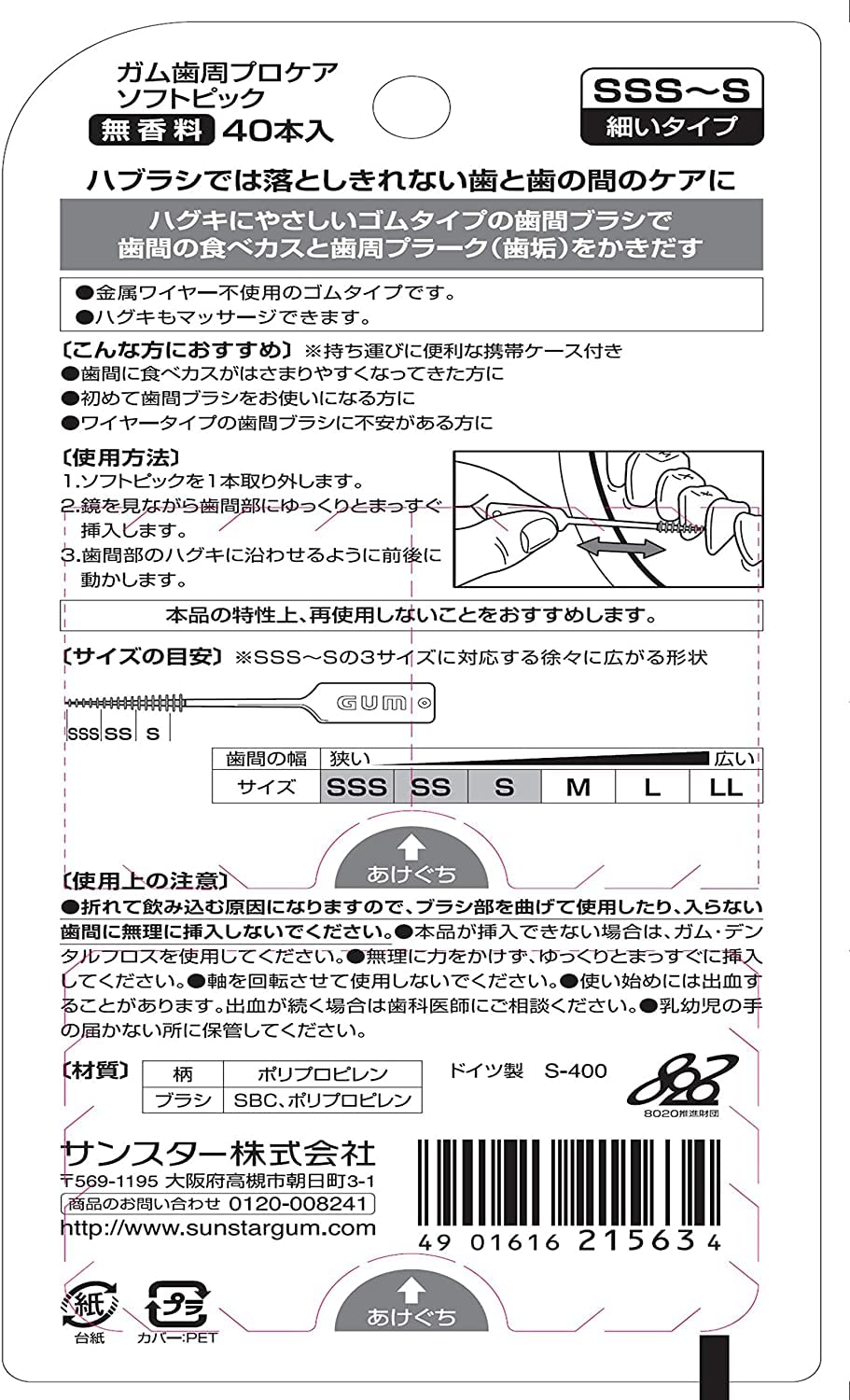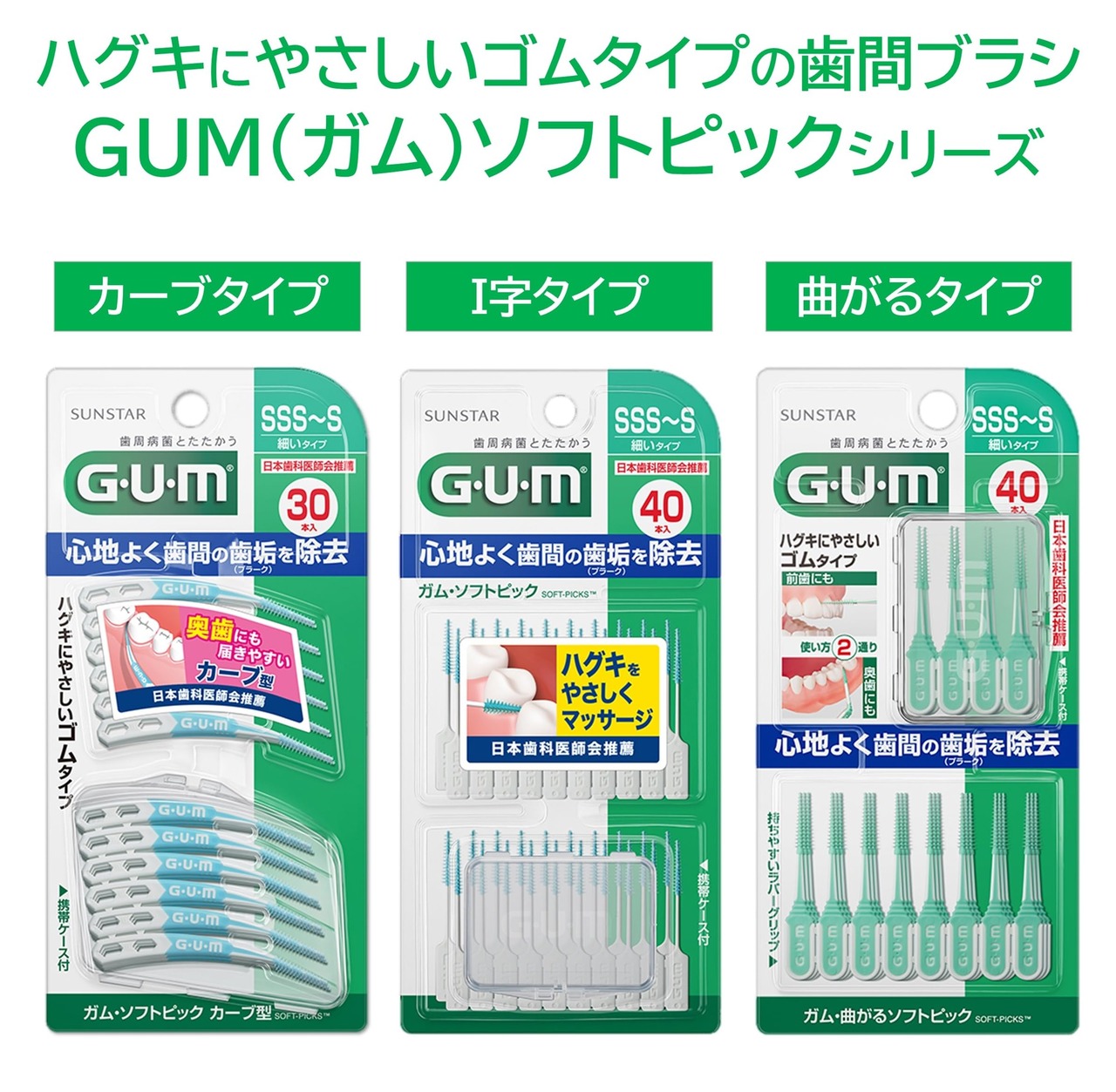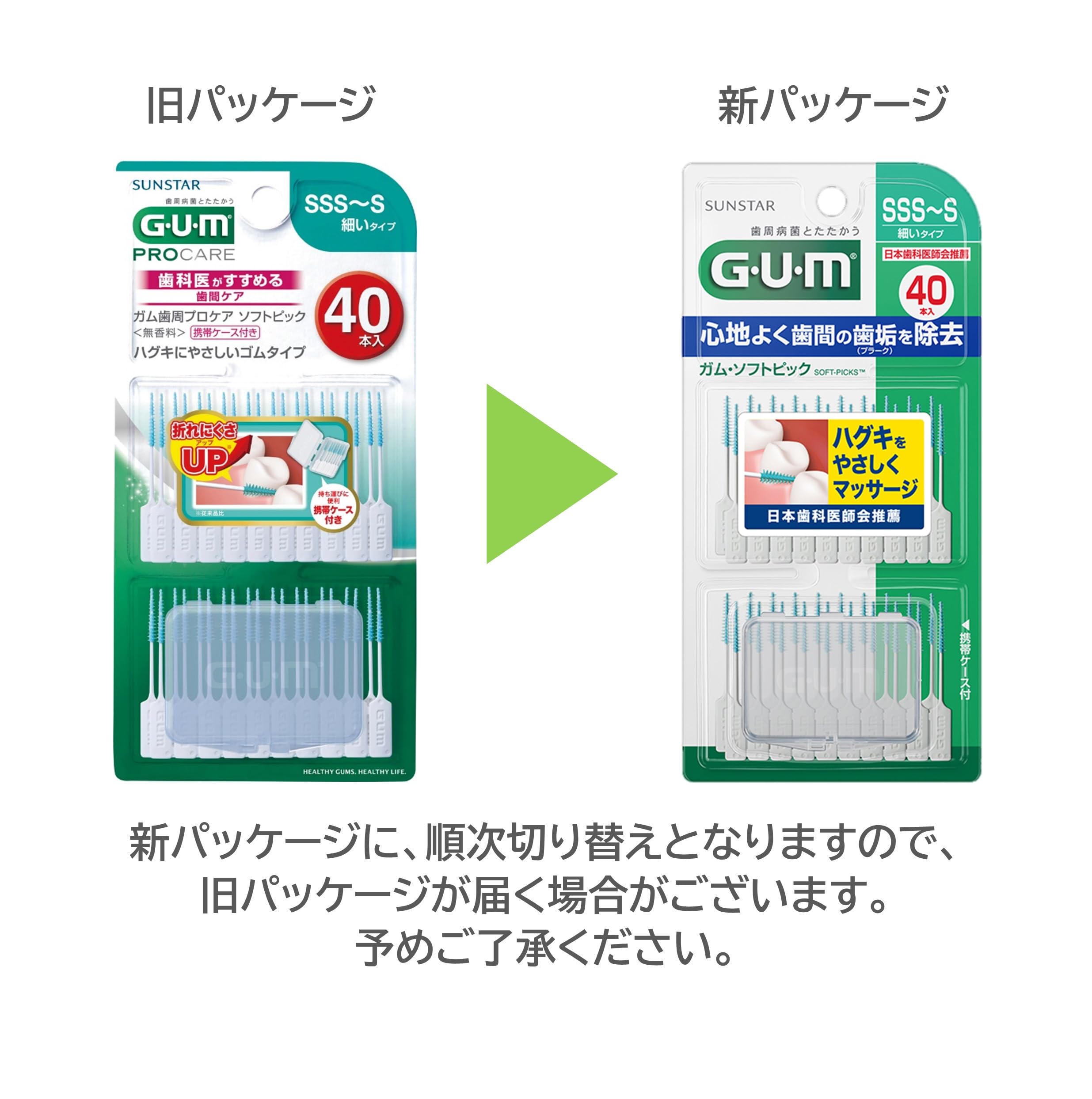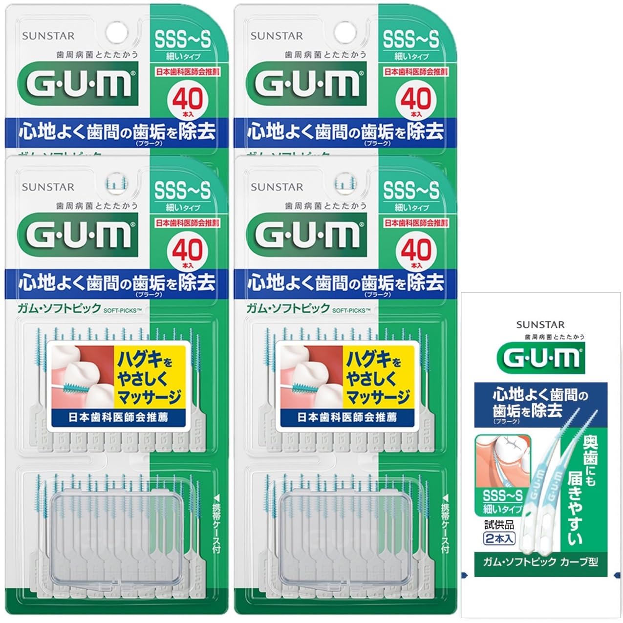 GUM(ガム) 歯周プロケア ソフトピック 歯間ブラシ やわらか ゴムタイプ ケース付き [サイズ:SSS~S 細いタイプ] 40本入×4個パック+おまけ付き