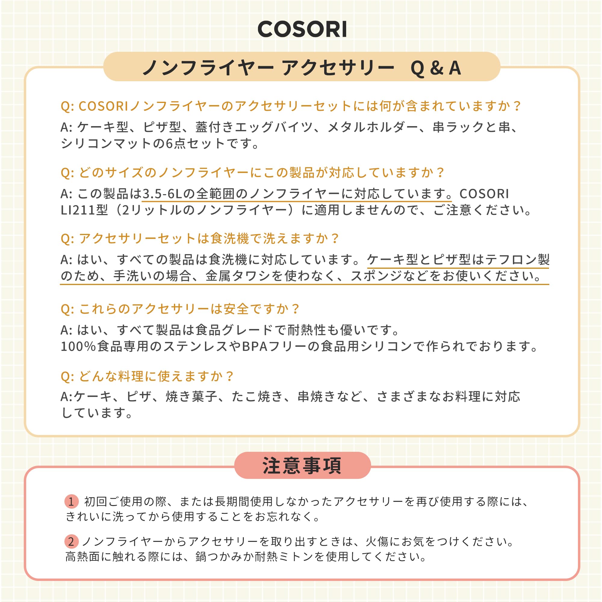 【BPAフリー・耐熱・安心安全】COSORIノンフライヤーアクセサリーは安全な食品グレードでかつ耐熱、しかもBPAフリー材料で作られたので、有害な化学物質の心配がなく、耐熱範囲もノンフライヤーの温度調整範囲より広い、面白くて健康的な料理をお楽しみいただけます。