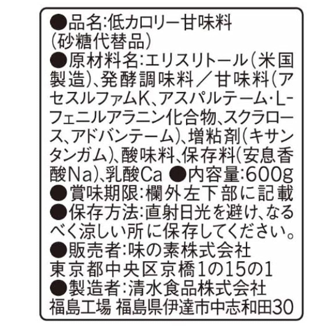 原材料:エリスリトール、発酵調味料/甘味料(アセスルファムK、アスパルテーム・L-フェニルアラニン化合物、スクラロース、アドバンテーム)、増粘剤(キサンタンガム)、酸味料、保存料(安息香酸Na)、乳酸Ca