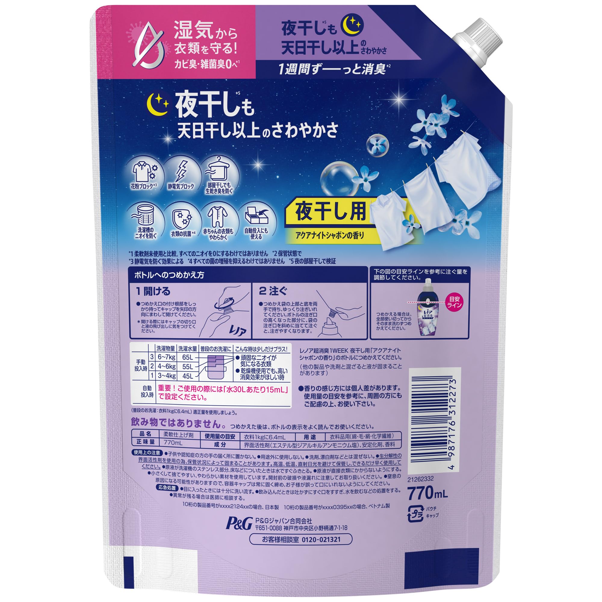 【数量限】レノア Lenor 超消臭1WEEK 柔軟剤 夜干し用 アクアナイトシャボンの香り 詰め替え 770mL