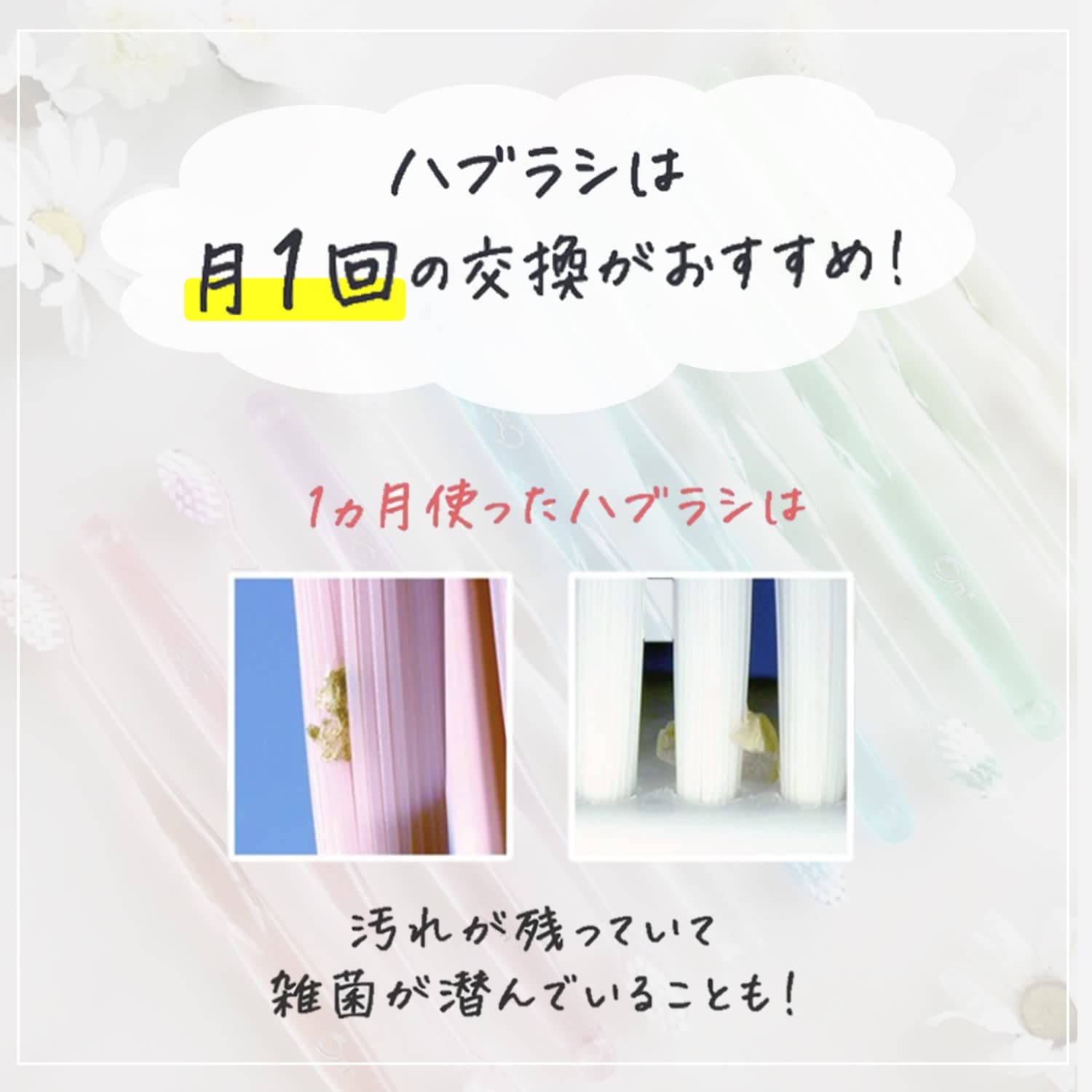 ●歯みがき後は毛の根元まで充分洗い落とし、水をよく切って風通しのよい所に保管してください。●変色、変形の恐れがありますので、塩素系殺菌剤、漂白剤、熱湯、精油は使用しないでください。●軽い力で小刻みに磨きましょう。力の入れすぎは、ハグキを傷つける原因にもなります。