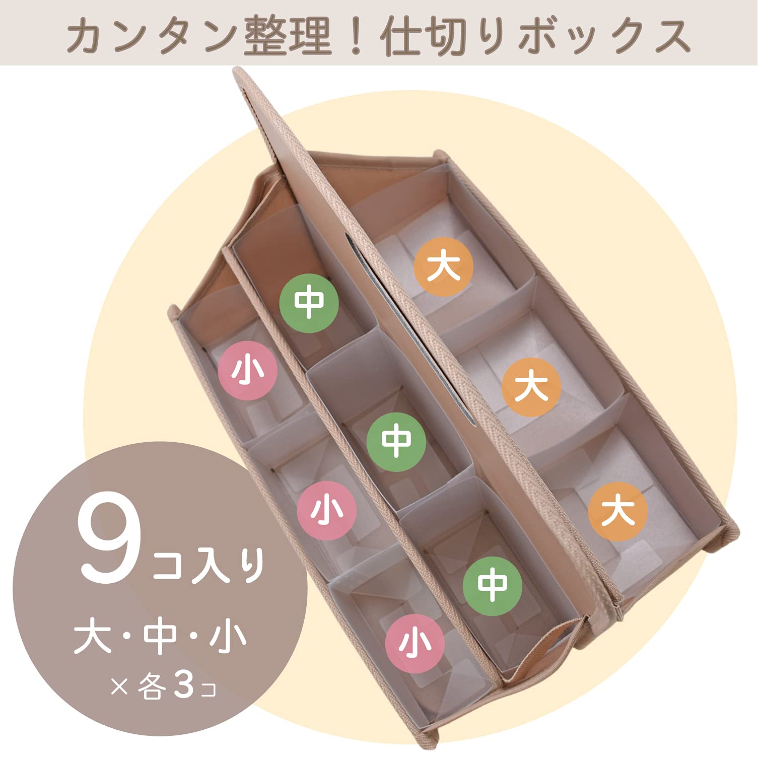 【特長3】3サイズ×各3個の仕切りボックス付き