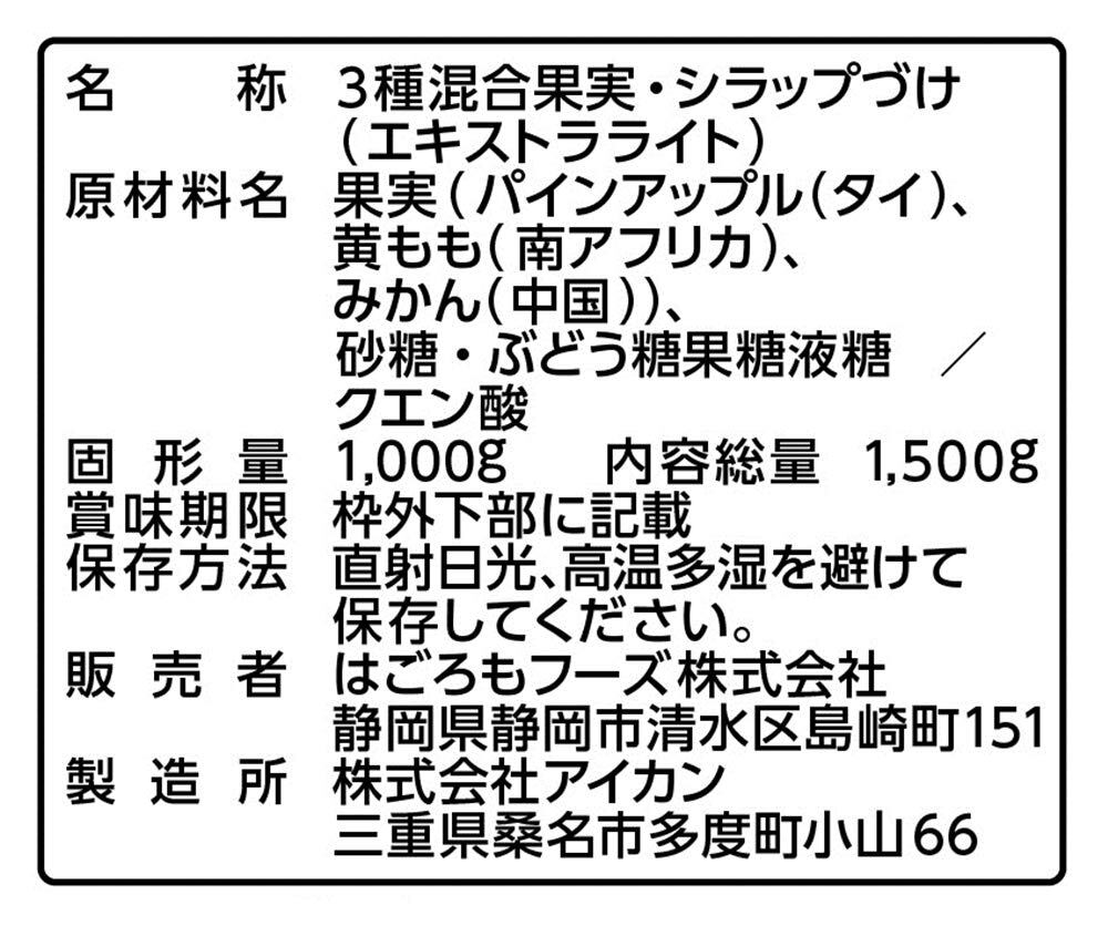 みかん、パイン、黄桃の3つのフルーツをミックスし、甘みを抑えたシラップ(エキストラライト)で仕上げた