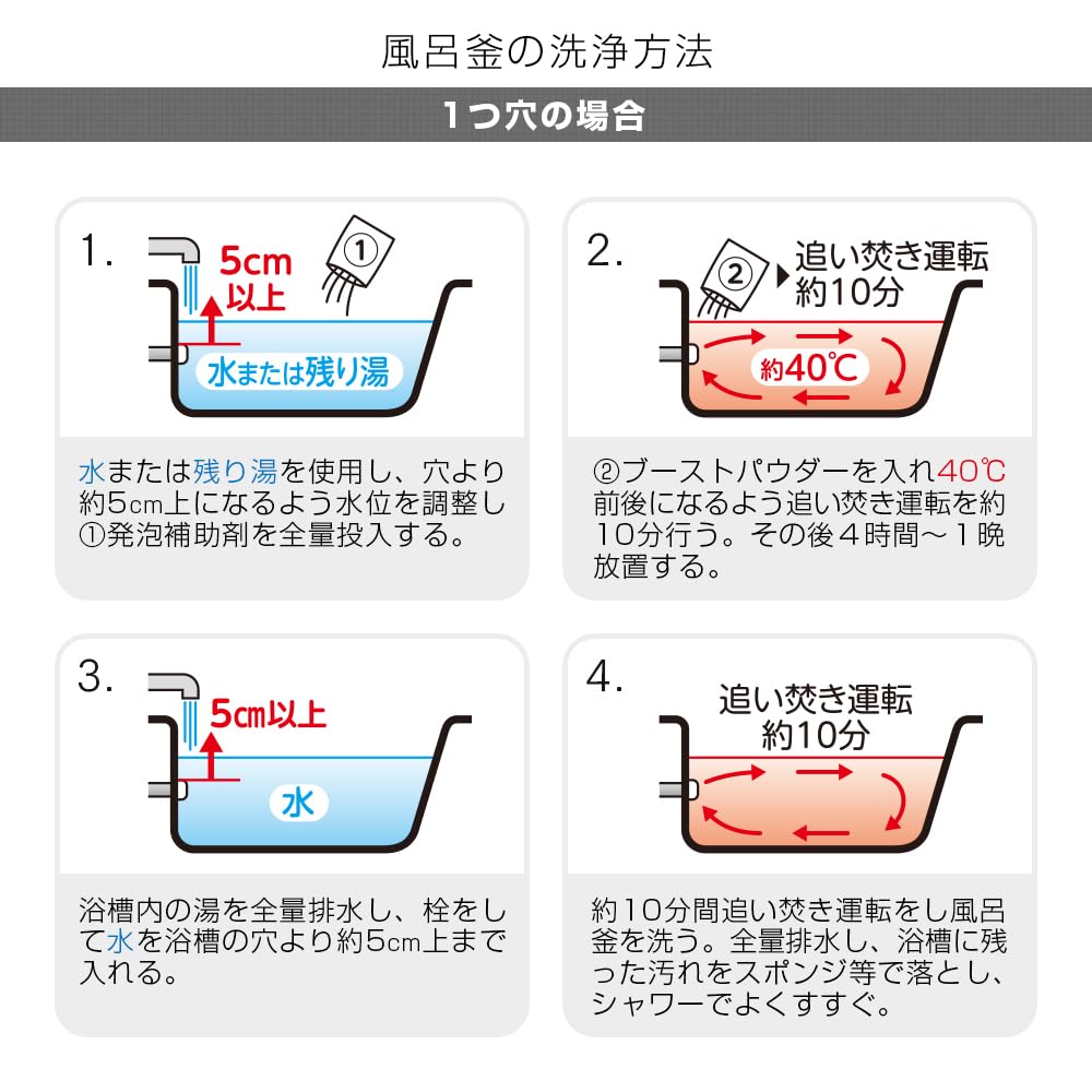 【使用方法】<風呂釜の洗浄>■1つ穴の場合(1)洗浄:水または残り湯を使用し、穴より約5cm上になるよう水位を調整し、①発泡補助剤を全量投入する。※入浴剤の入った残り湯は使用しない。※髪の毛等のゴミが入らないよう浴槽のフィルターは外さず使用する。②ブーストパウダーを穴の付近に粉が舞うのを防ぐためになるべく水面に近づけてゆっくり投入し、40℃前後になるよう追い焚き運転を約10分行う。その後、4時間?1晩放置する。※24時間以上放置しない。小物を洗浄する場合はここで行う。(2)すすぎ:浴槽内の湯を全量排水し、栓をして水を浴槽の穴より約5cm上まで入れる。約10分間追い焚き運転をし風呂釜を洗う。その後、全量排水し、浴槽に残った汚れをスポンジ等で落とし、シャワーでよくすすぐ。■2つ穴の場合(1)洗浄:水または残り湯を使用し、穴より約5cm上になるよう水位を調整し、①発泡補助剤を全量投入する。※入浴剤の入った残り湯は使用しない。※浴槽のフィルターがある場合は、髪の毛等のゴミが入らないよう外さず使用する。②ブーストパウダーを穴の付近に粉が舞うのを防ぐためになるべく水面に近づけてゆっくり投入し、40℃前後になるよう追い焚き運転を約10分行う。その後、4時間?1晩放置する。※24時間以上放置しない。小物を洗浄する場合はここで行う。(2)すすぎ:ホースを使い下穴に向け勢いよく水を出し、釜内部の汚れや湯ドロを流し出し、浴槽内の水を全量排水する。※ホースが無い時はシャワーを使う。※完全に湯ドロを出し切らないと湯アカ・湯ドロなどが入浴中に出てくることがある。その後、浴槽をシャワーでよくすすぐ。<小物の洗浄>①浴槽内にイス、洗面器、風呂フタ、おもちゃ(プラスチック製)などの小物を入れ、6時間以上つけ置きする。※24時間以上放置しない。②小物類を取り出しよくすすぐ。汚れが残っている場合は、スポンジ等でこすり洗いをする。※清潔を保つため、1?2ヶ月ごとの定期的な使用をおすすめします。※粉が舞う恐れがあるため、顔を近づけて開封しない。