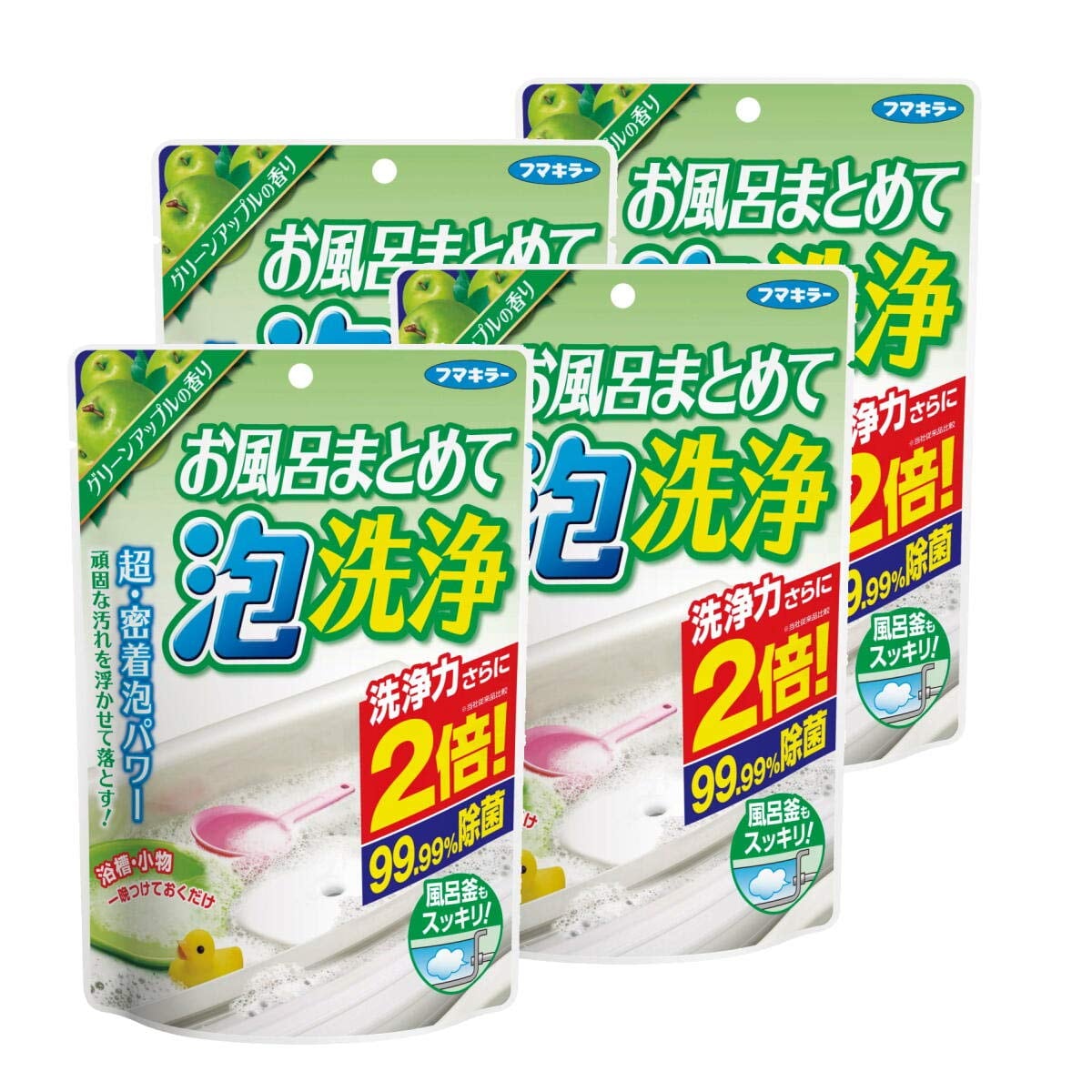 【特価】お風呂まとめて泡洗浄 4個パック 超密着泡で強力洗浄&99.99%除菌 風呂釜・小物 一晩つけ置き グリーンアップルの香り フマキラー 【まとめ買い】
