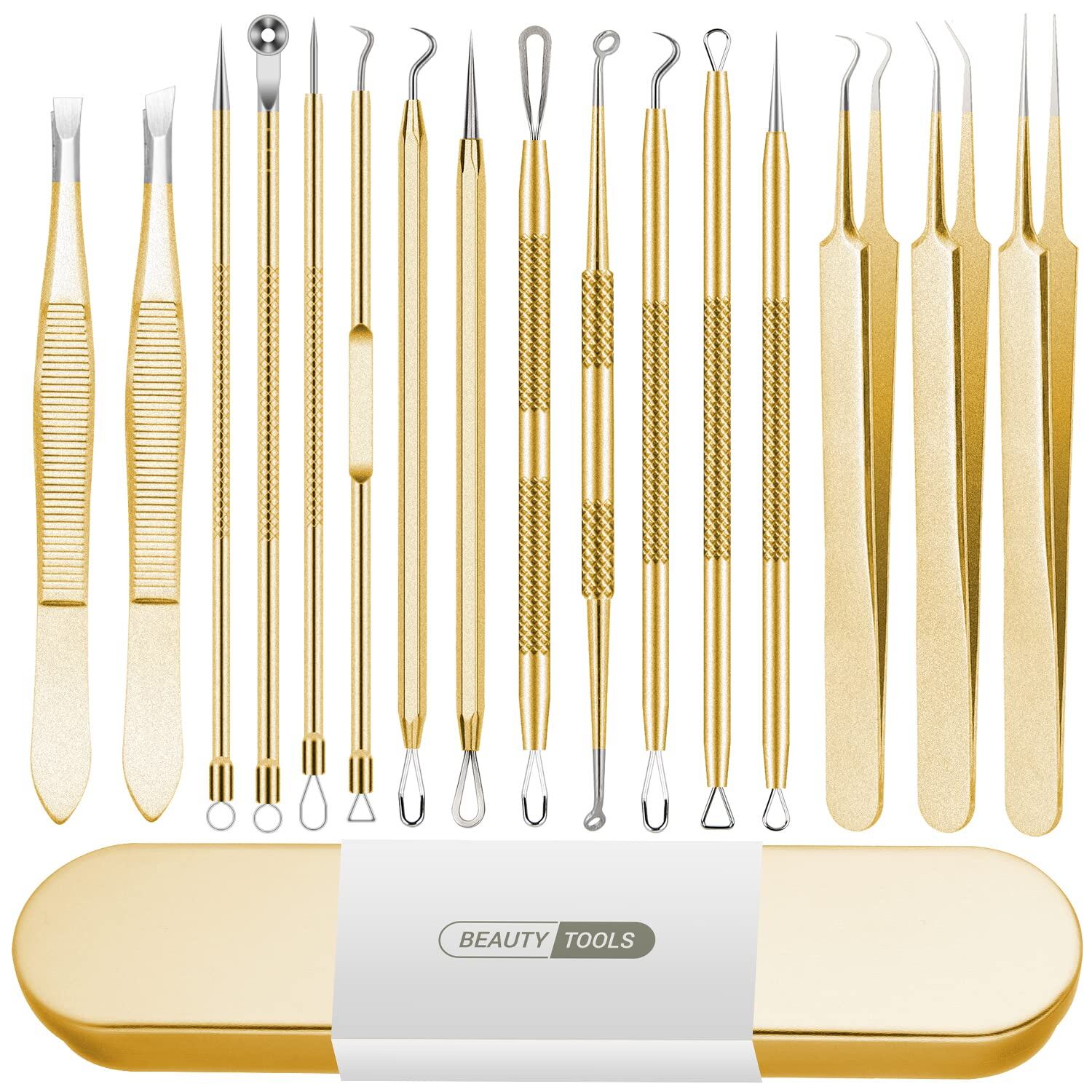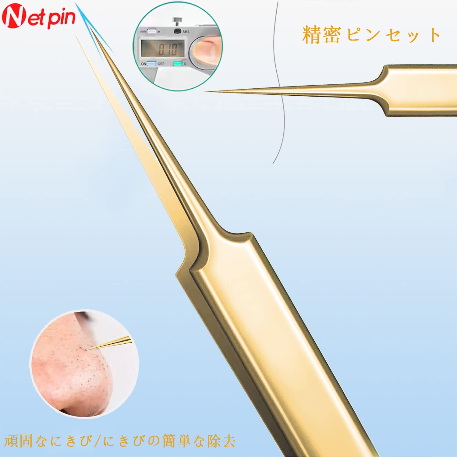 角栓 ピンセット 精密 ピンセット 角栓取り 毛抜き 16本セット ステンレス製 ニキビ針工具 先端幅<0.1mm コメドプッシャー ニキビ取り かくせんとり 黒ずみ取り 眉毛 鼻ケア 毛穴ケア 男女兼用 収納ケース付き 携帯便利 (黄金色)