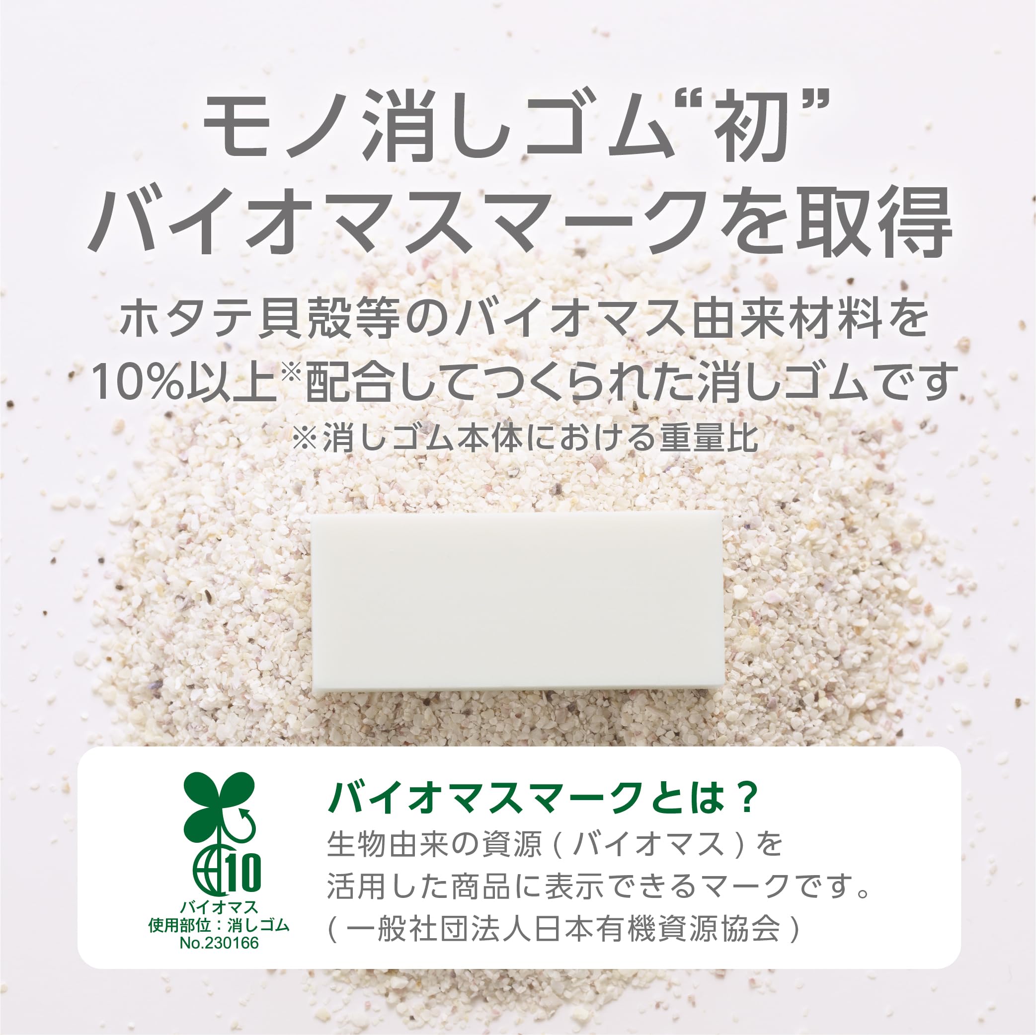 ホタテ貝殻由来のバイオマス素材を消しゴム本体の重量比10%以上配合した、環境に優しい消しゴムです。