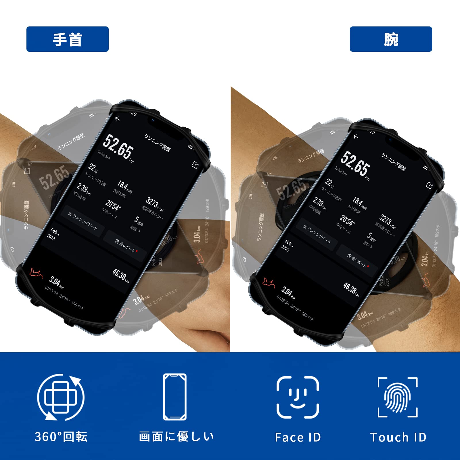 【360度回転式】360°回転できるデザインで自由に角度を調節して、楽々に写真、撮影、チャット等を操作できます。ランニング/登山/ジョギング/ウォーキング/サイクリング/ヨガ/ジムなどに適用しています。