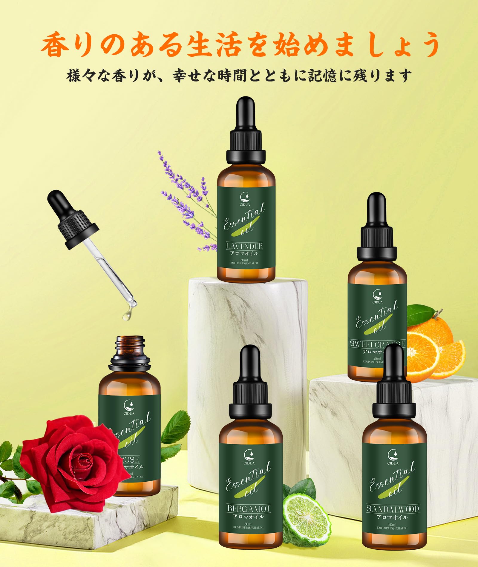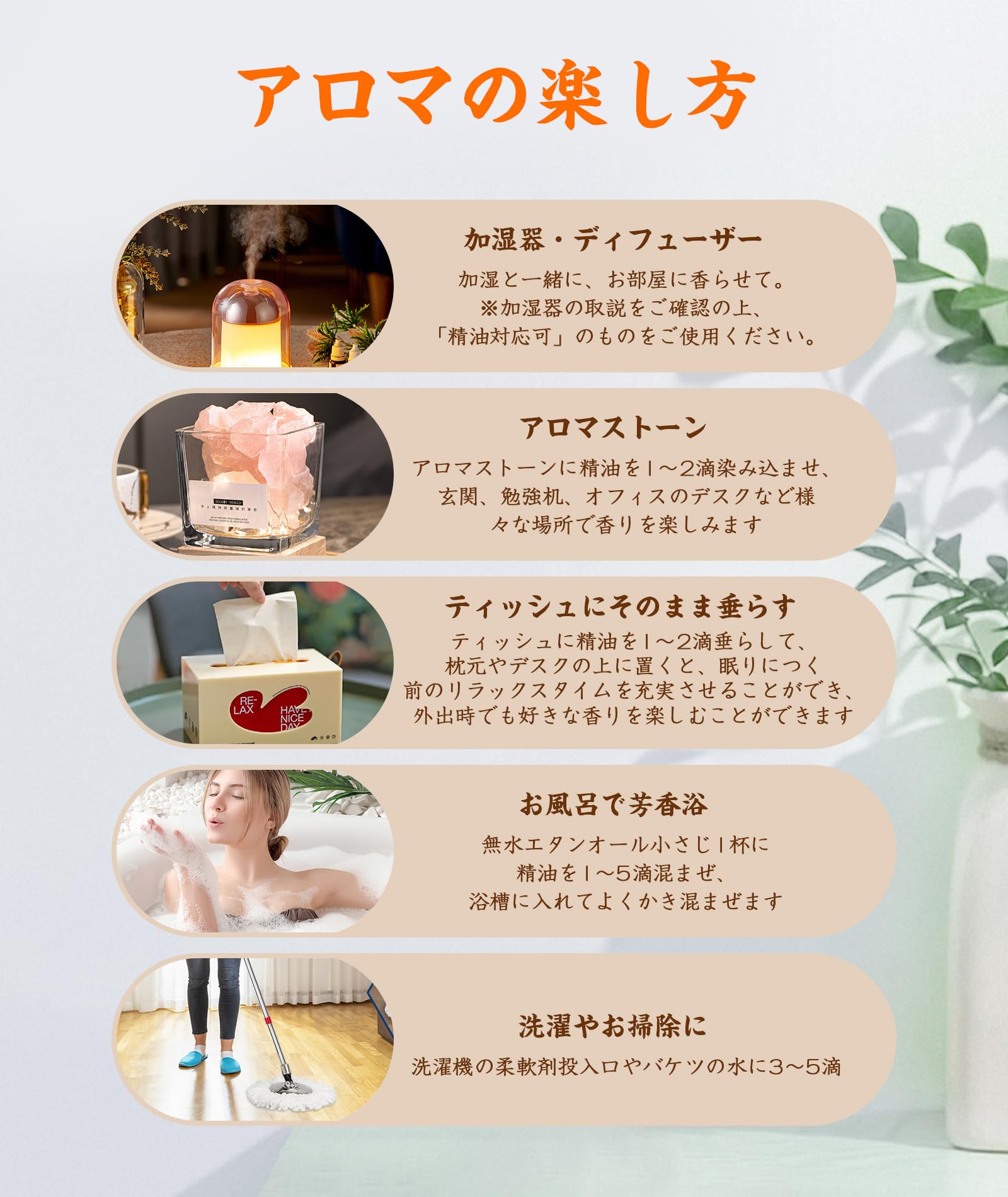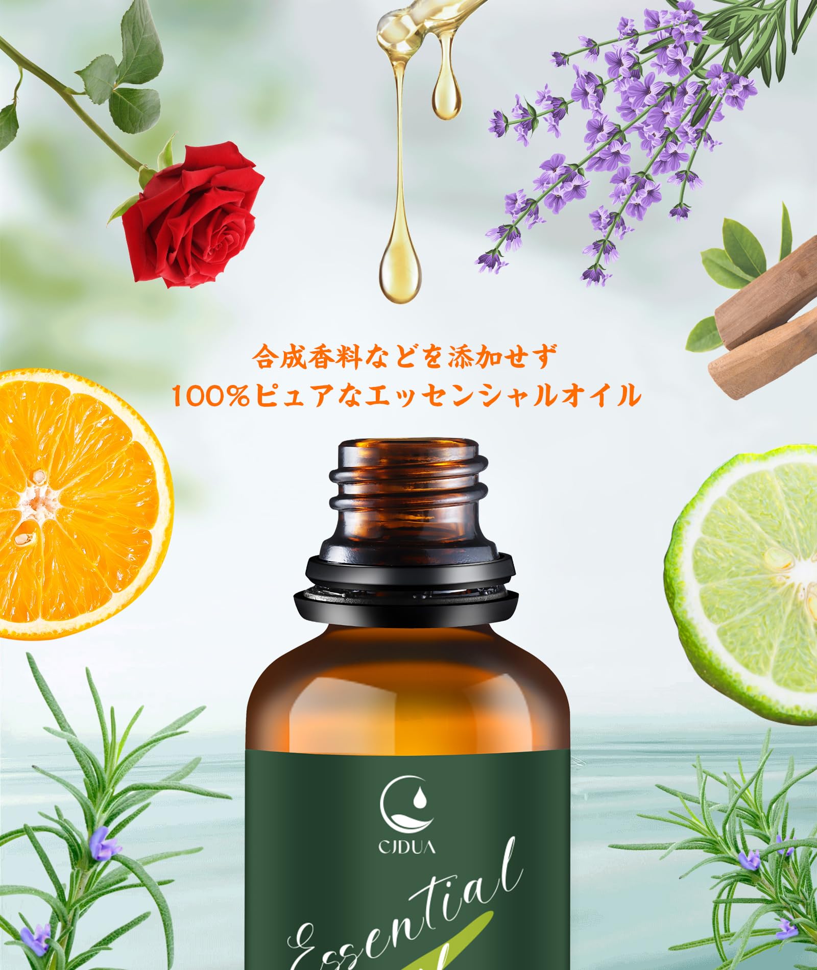 【アロマでお生活を豊かに】アロマディフューザー、ハンカチ、洗濯、掃除、名刺など、様々なシーンに広く使用でき、目覚め、仕事、休息、睡眠といった日々の行動を、植物の香りによっていっそう快適なものにしてくれます。様々な香りが、幸せな時間とともに記憶に残ります。