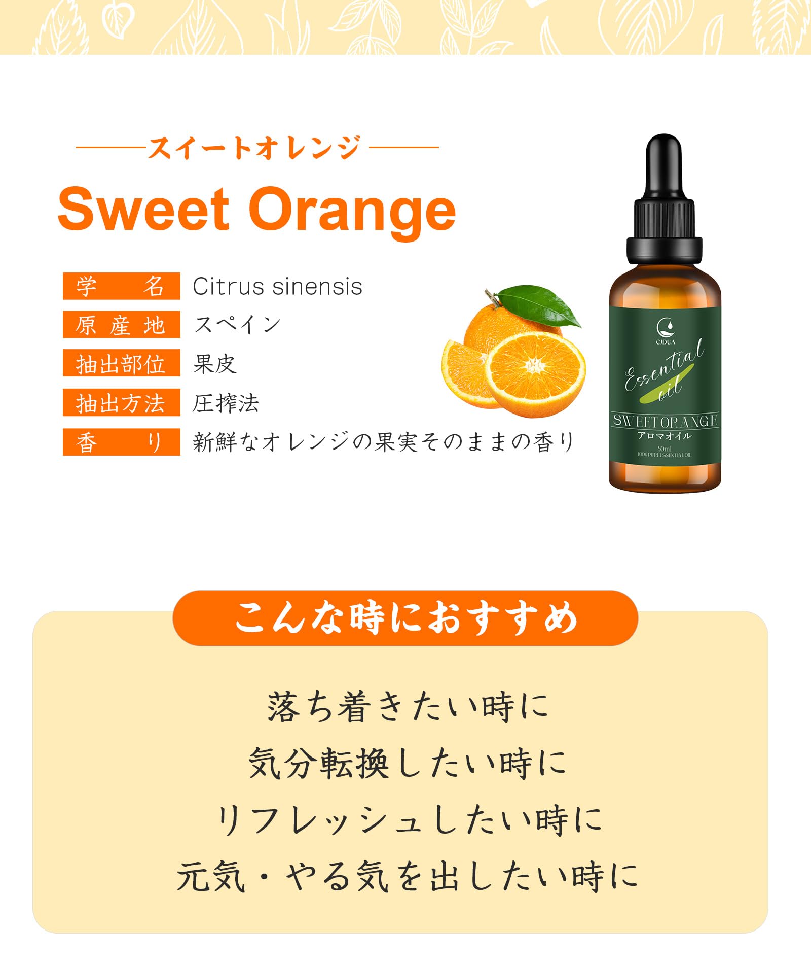 スィートオレンジ 精油 50ml エッセンシャルオイル 純天然抽出 自然な香り アロマオイル ディフューザー・アロマストーン・日常生活 アロマ初心者に プレゼントにも最適 Sweet Orange Essential Oil