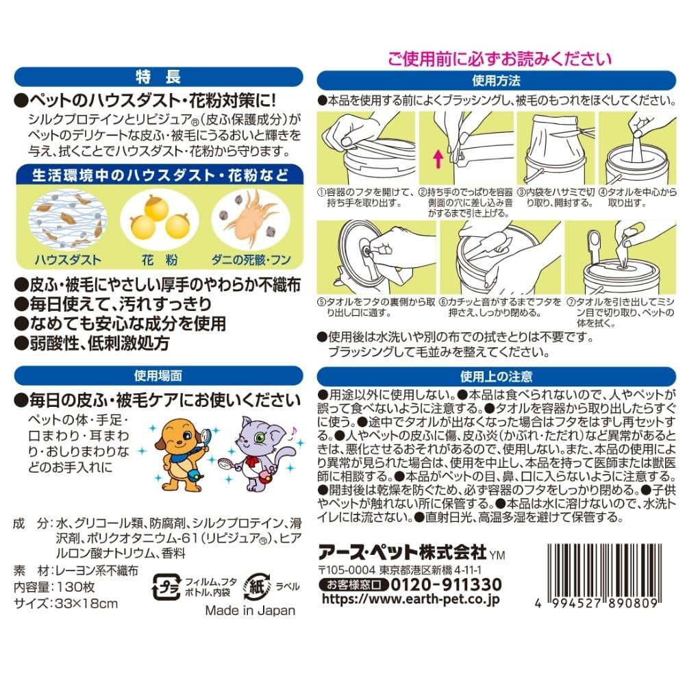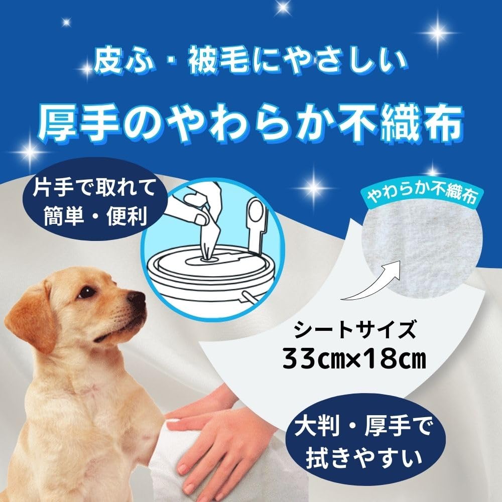 拭くだけで簡単にお手入れできるボディーシートの大容量タイプ。シルクプロテイン・リピジュア配合で皮膚・被毛にうるおいと輝きを与えます。やわらかなメッシュシートタイプ。なめても安心。1枚サイズ33×18㎝
