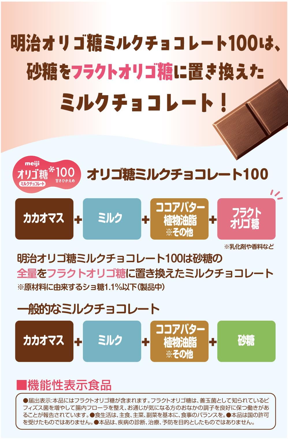 使用する砂糖を全て「腸内フローラを整える」「糖として吸収されない」フラクトオリゴ糖に置き換えた、ミルクチョコレート。使用する砂糖を全てフラクトオリゴ糖に置き換えた、甘さひかえめミルクチョコレート。3枚(15g)でフラクトオリゴ糖が3000mgが摂れる機能性表示食品。