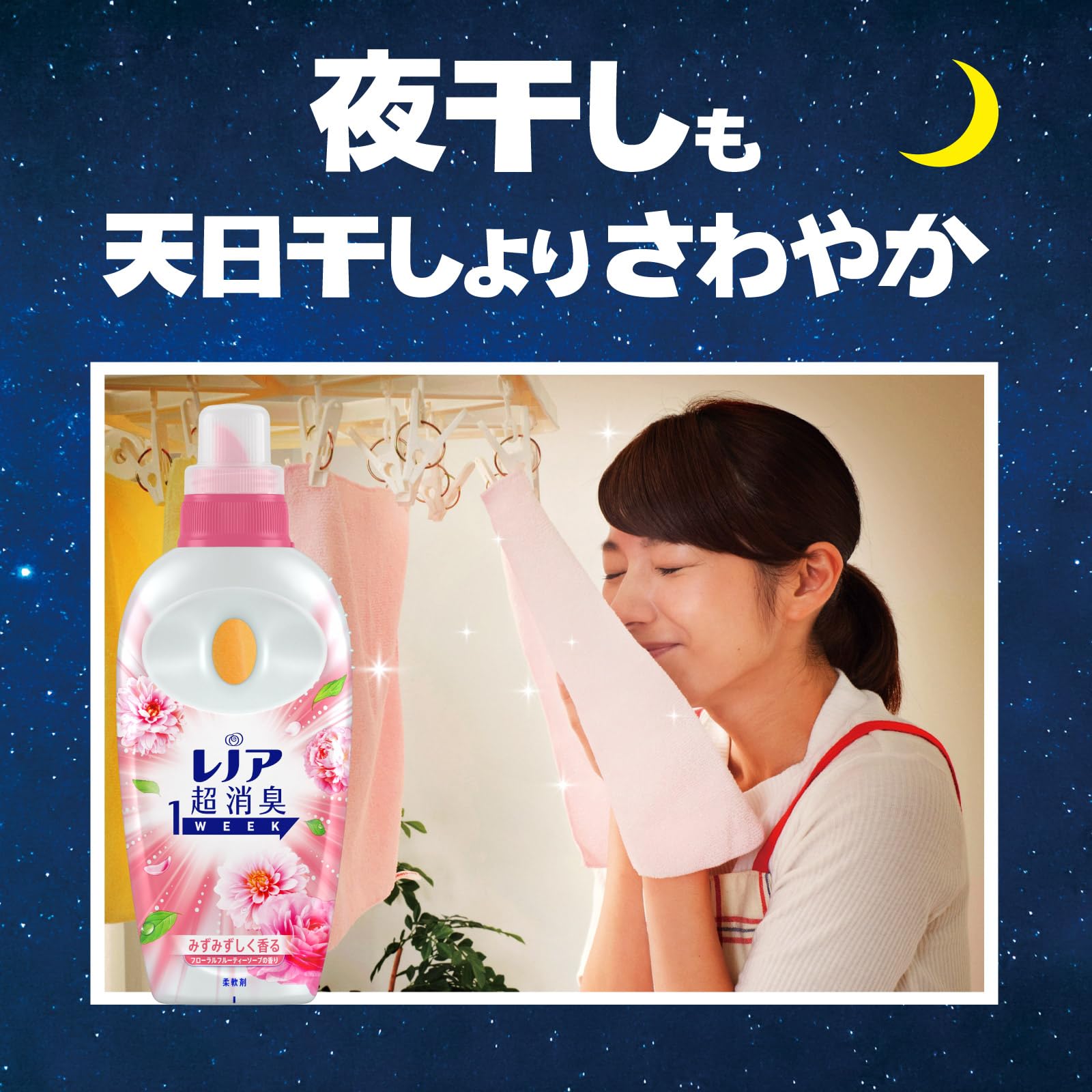 レノアなら、夜干しでも速乾(*1)&消臭。消臭成分が浸透、夜の間にじっくり消臭するから、夜干しなのに、天日干し以上のさわやかさに。 *1 綿のタオルで検証。