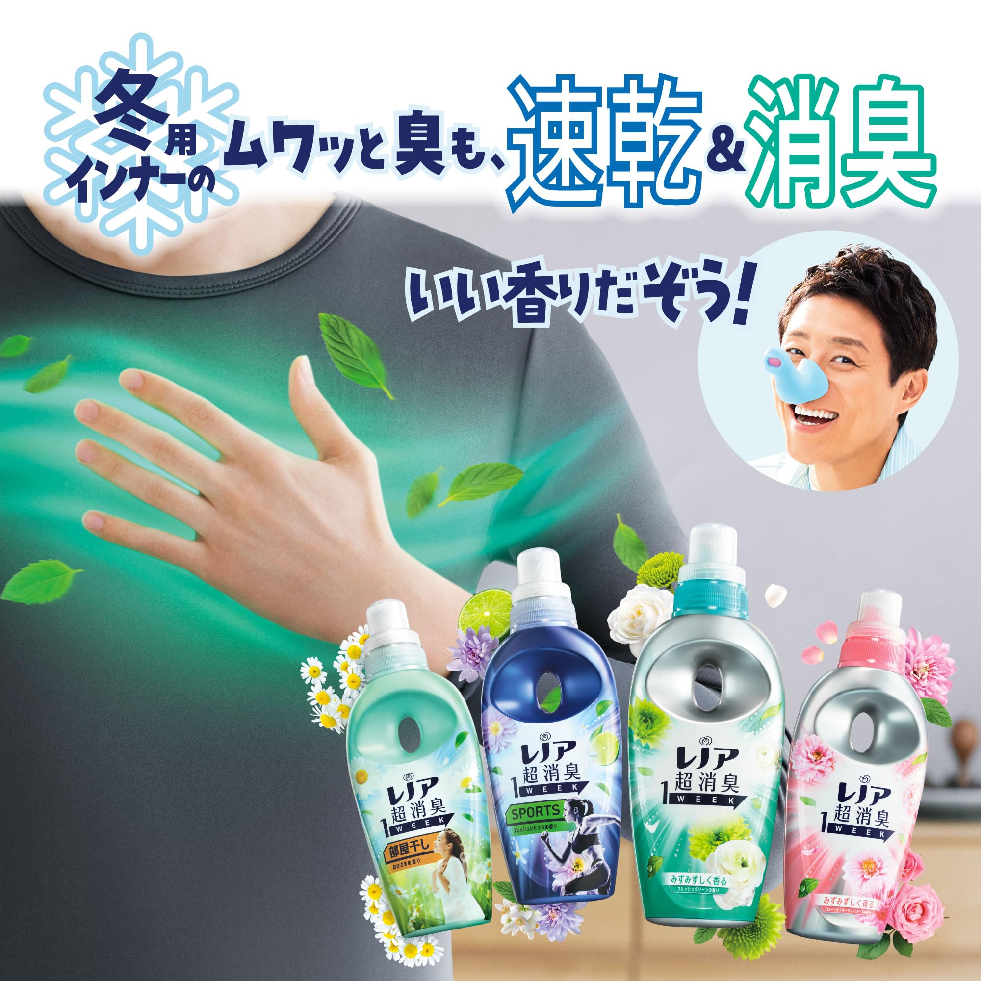 新しくなったレノア超消臭1weekは、汗をかいた時のニオイはもちろん、ベタつきまで防げるようになりました(*1)。冬に気になる、保温インナーの汗のニオイ。汗をかいてもさらっと吸収して速乾(*1)。しかも、何度汗をかいてもニオイ0へ(*2) *1 自社他柔軟剤と比較。 *2 柔軟剤未使用と比較。すべてのニオイを0にするわけではありません。