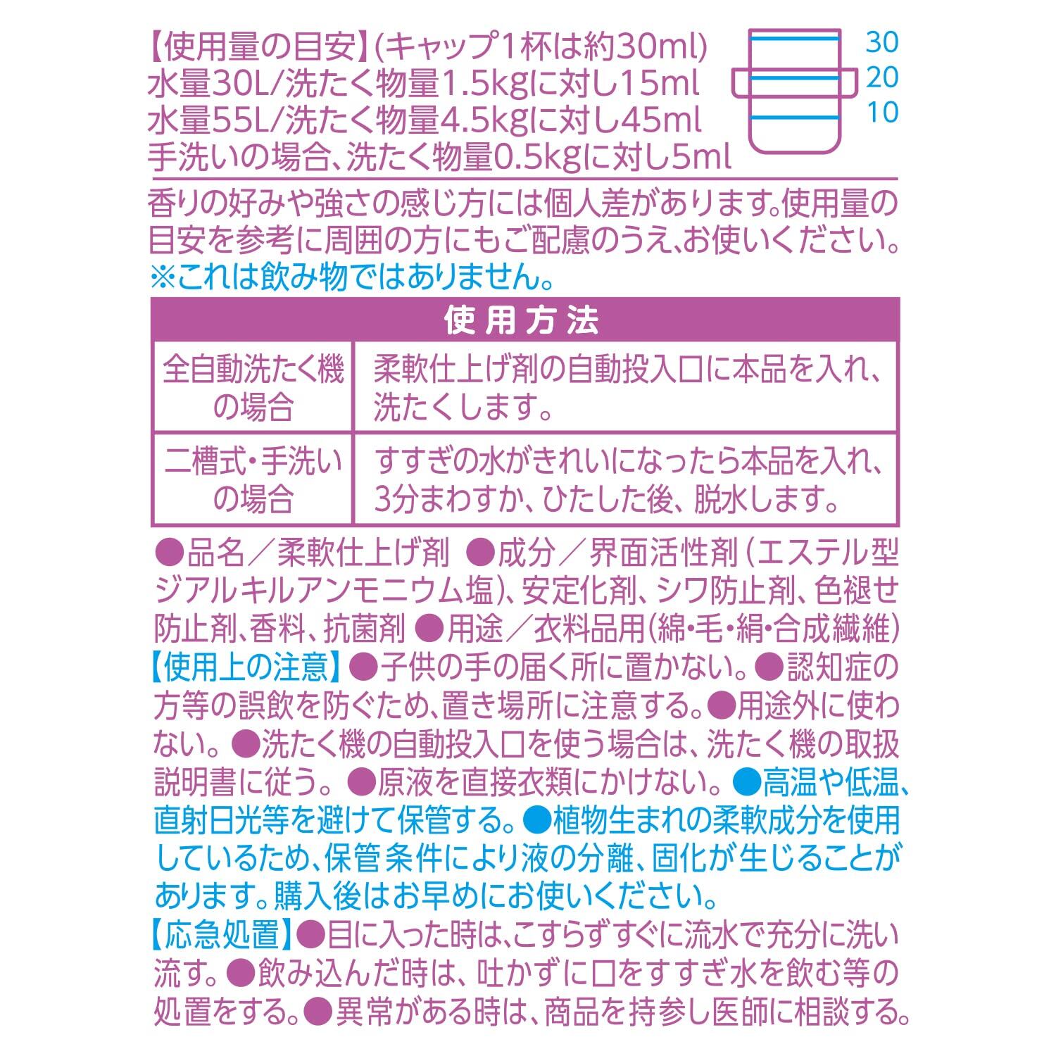 原材料: 界面活性剤(エステル型ジアルキルアンモニウム塩)、安定化剤、シワ防止剤、色褪せ防止剤、香料、抗菌剤