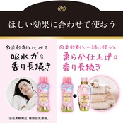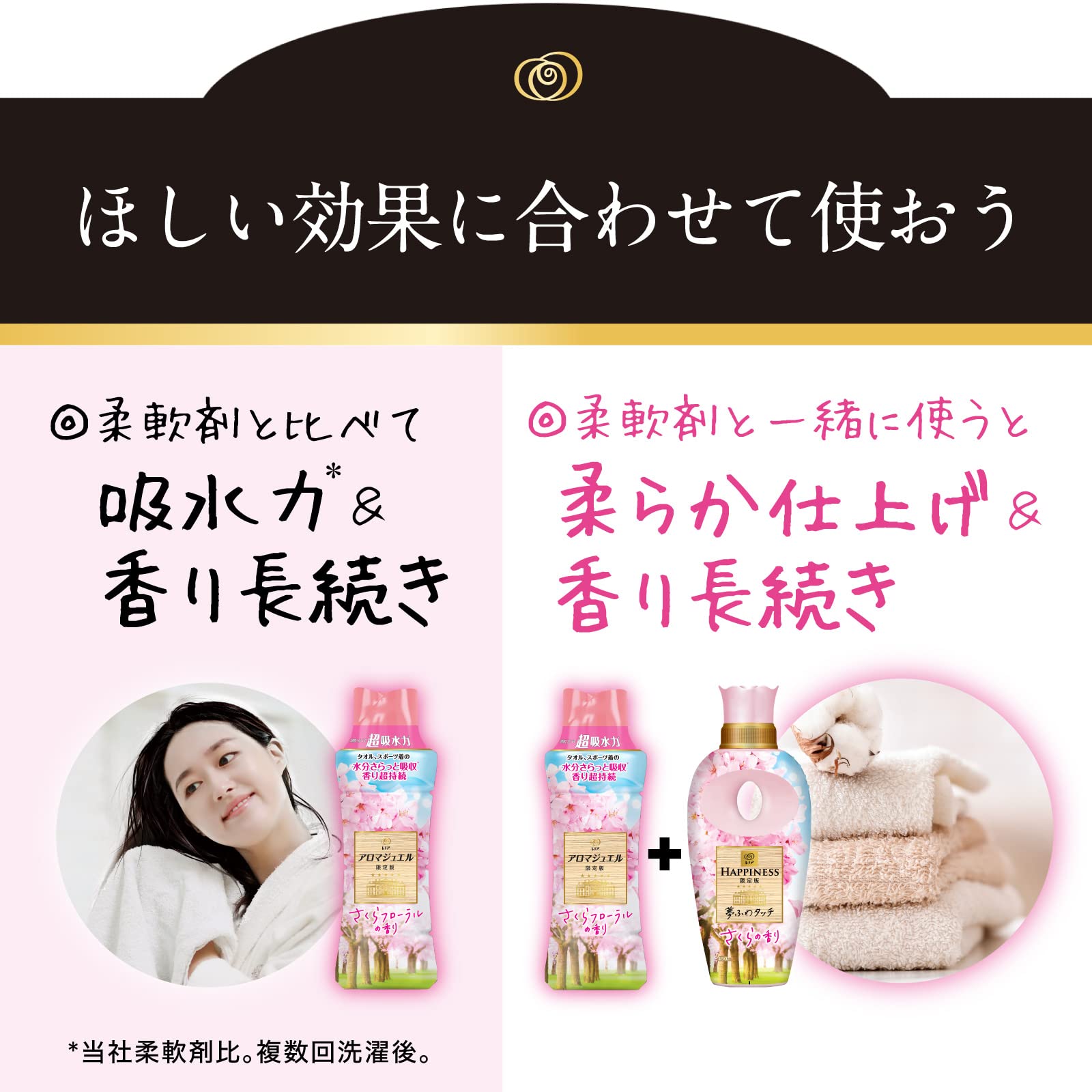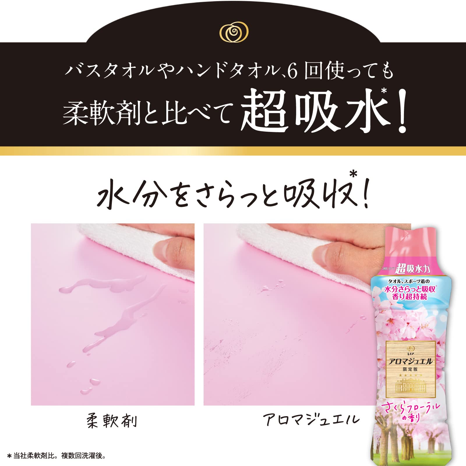 柔軟剤と比べて超吸水力*タオル、スポーツ着の水分さらっと吸収* 香り超持続髪ふくタオルの水分さらっと吸収*スポーツの汗さらっと吸収*香り12週間長続き*1柔軟剤と比べて吸水力*&香り長続き柔らか仕上げ*当社柔軟剤比。複数回洗濯後。*1 保管状態で