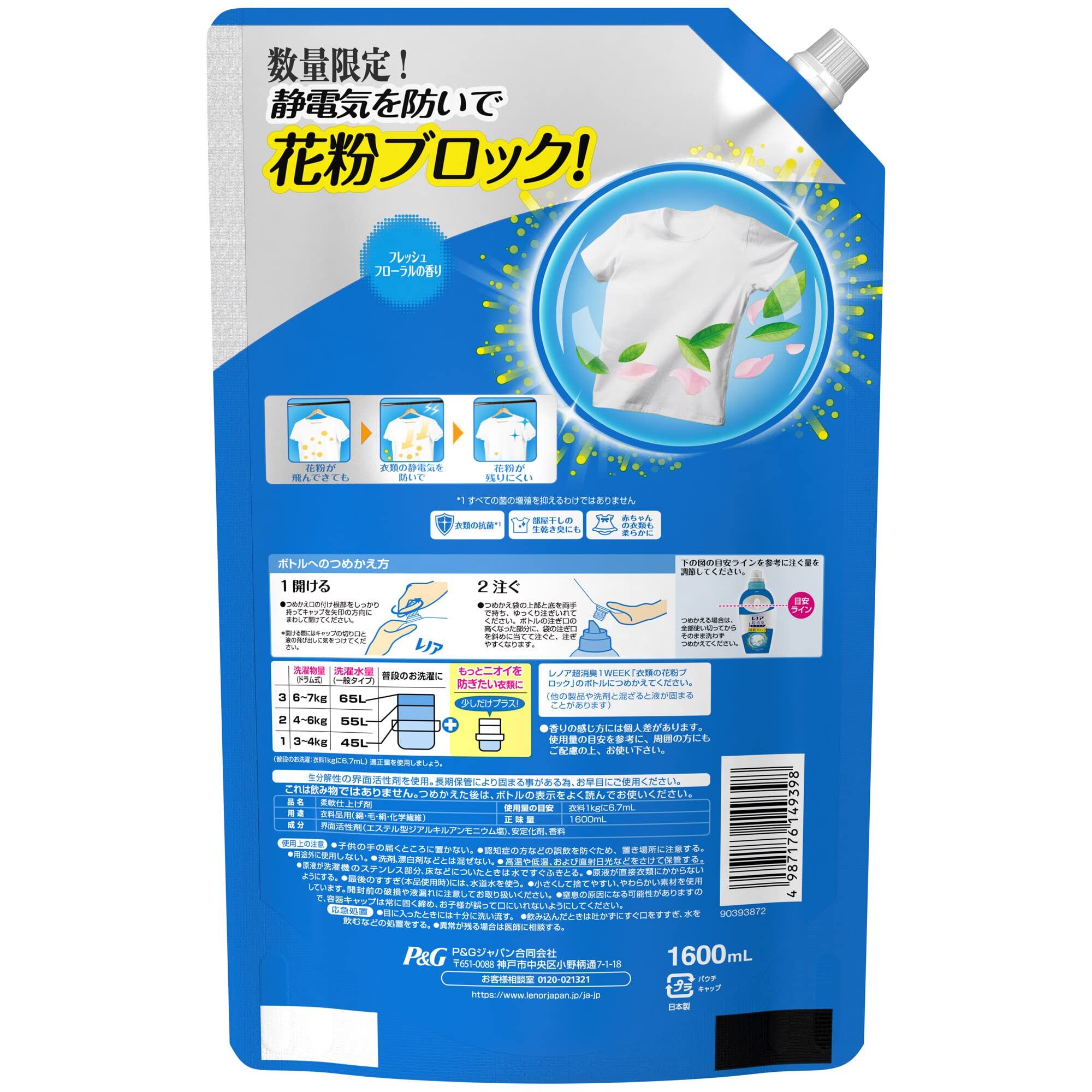 レノア 超消臭1week 柔軟剤 衣類の花粉ブロック フレッシュフローラル 詰め替え 1,600mL
