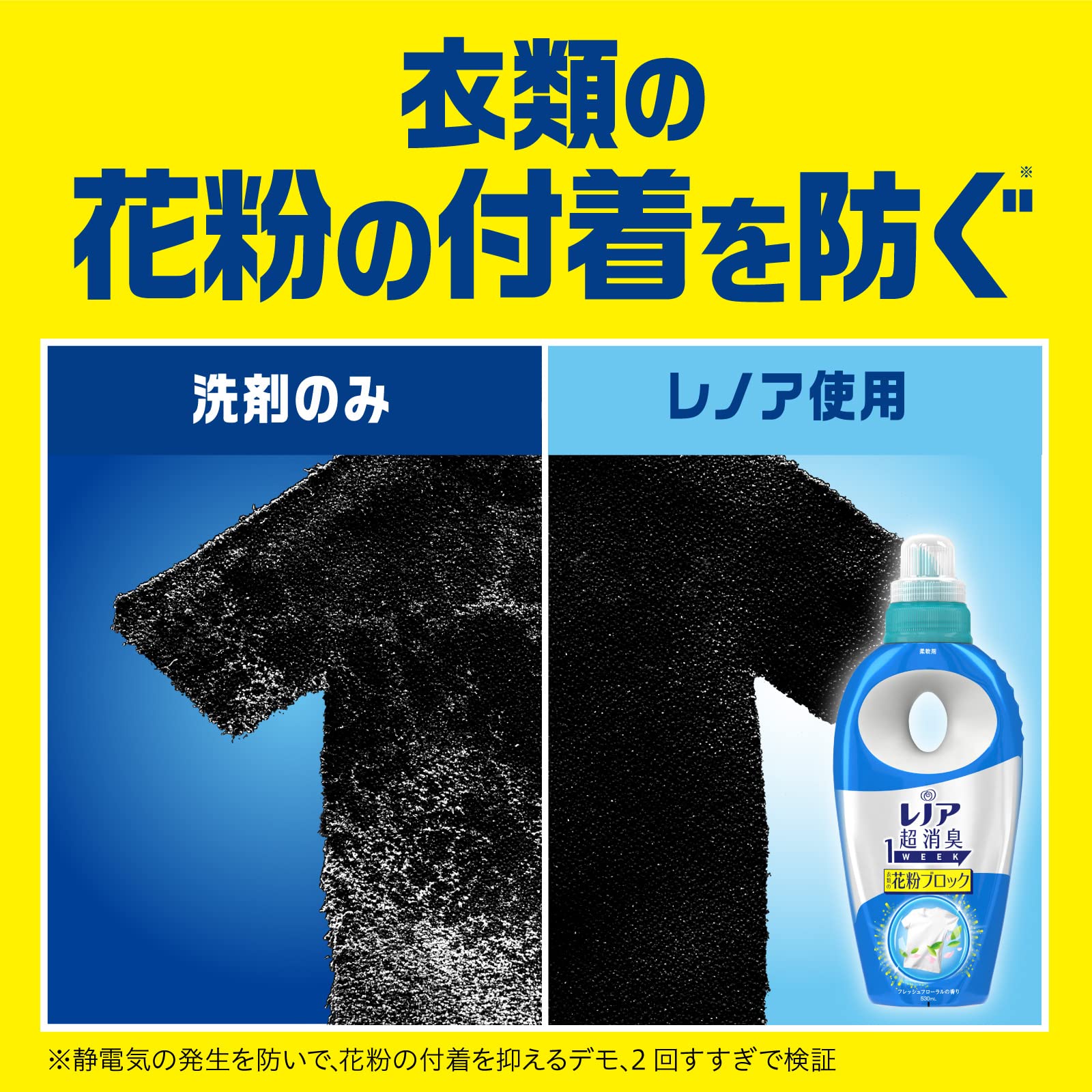 実は、花粉が衣類につく原因は静電気!レノア超消臭なら衣類の静電気を防ぐから、衣類に花粉が付着するのをブロック。洗濯物を干しているときも、外から帰宅したときも、衣類に花粉がつきにくいから、部屋への持ち込み花粉まで防ぎます!柔軟剤で花粉対策!