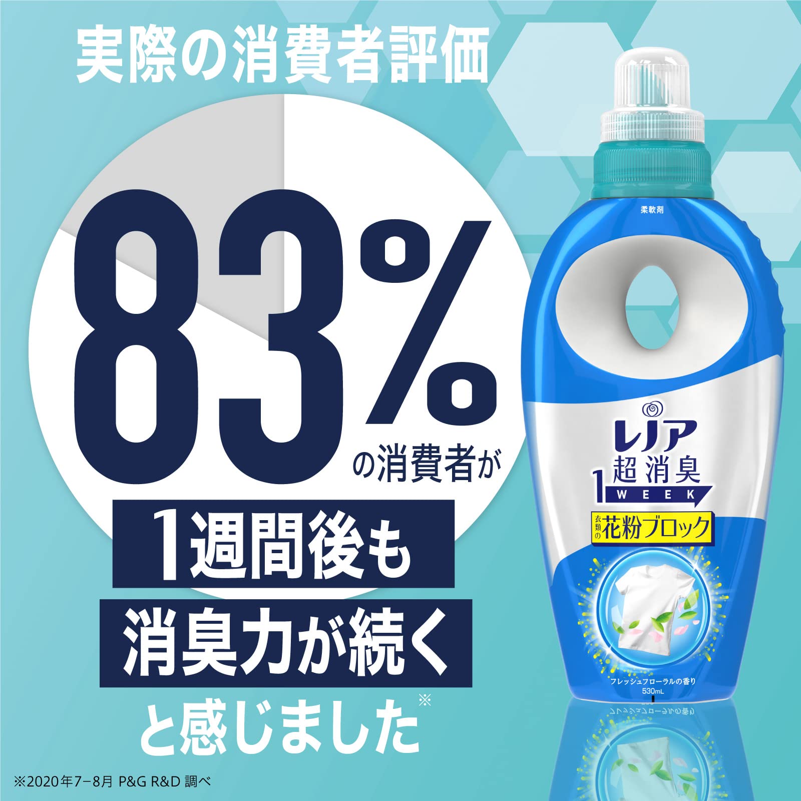 80%以上が実感 1週間の消臭効果。 レノア超消臭1WEEKの効果は、80%以上の消費者が“1週間後も消臭力が続くと実感しています。(P&G調べ)
