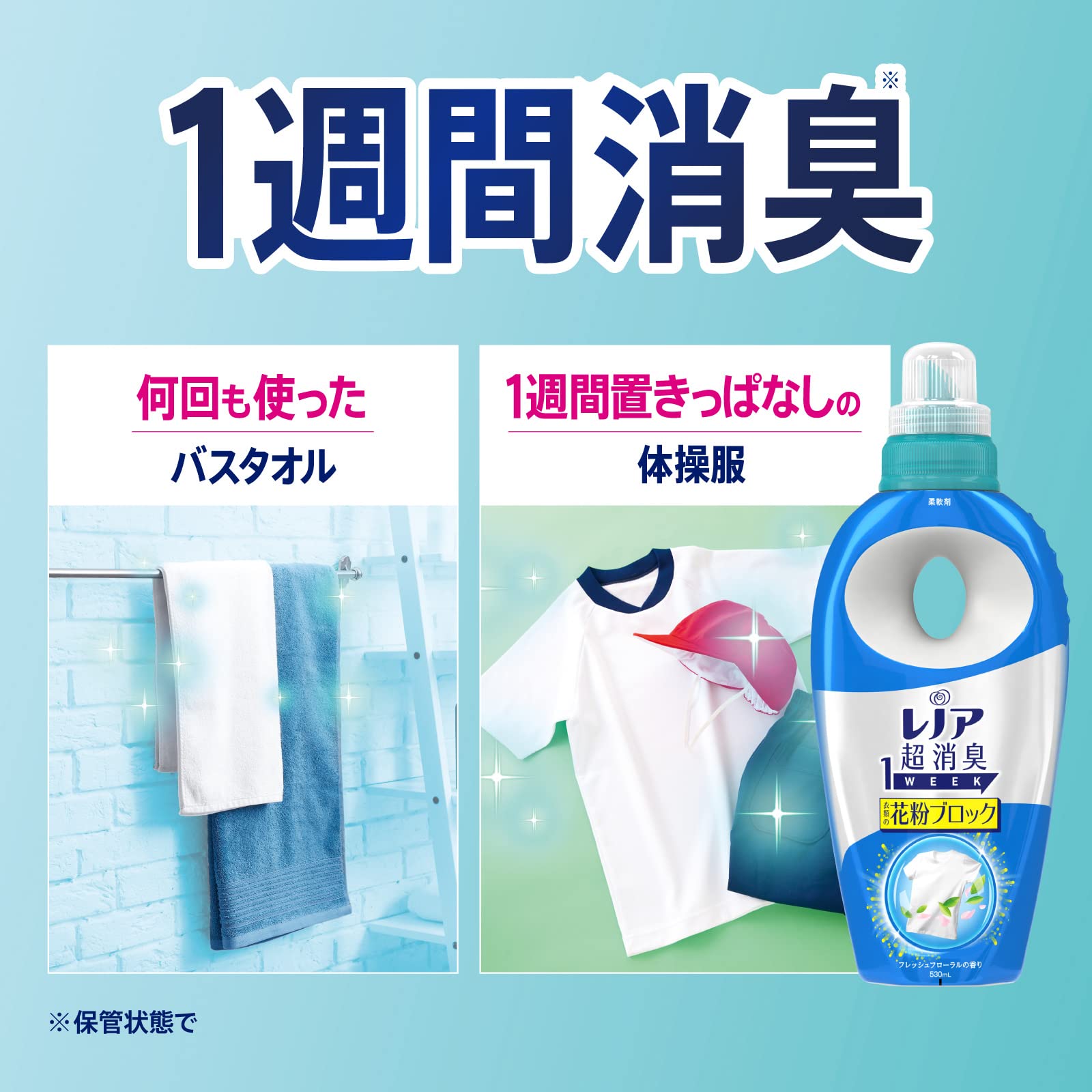 レノア超消臭1WEEKは特許カプセルIN。 今までは時間が経つと、効果がなくなっていた消臭カプセルを大改良! さらに特許*1取得の消臭カプセル配合。洗濯・干す間だけでなく、着用中も、1週間*2も消臭効果を発揮し続ける事が可能に! (*1:日本特許第6212079号 *2:保管状態で)