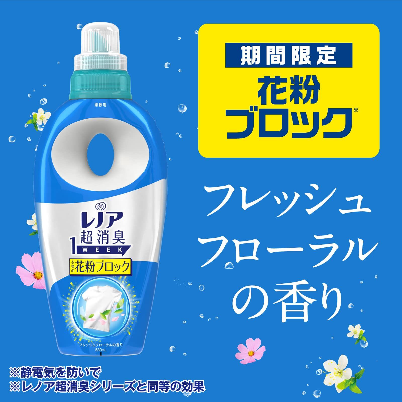 柔軟剤 数量限定! 静電気を防いで花粉ブロック!花粉が飛んできても 衣類の静電気を防いで 花粉が残りにくい衣類の抗菌*1部屋干しの生乾き臭にも赤ちゃんの衣類も柔らかに通常※の約4倍!※レノア超消臭1WEEK「衣類の花粉ブロック」つめかえ(400mL) *1 すべての菌の増殖を抑えるわけではありません